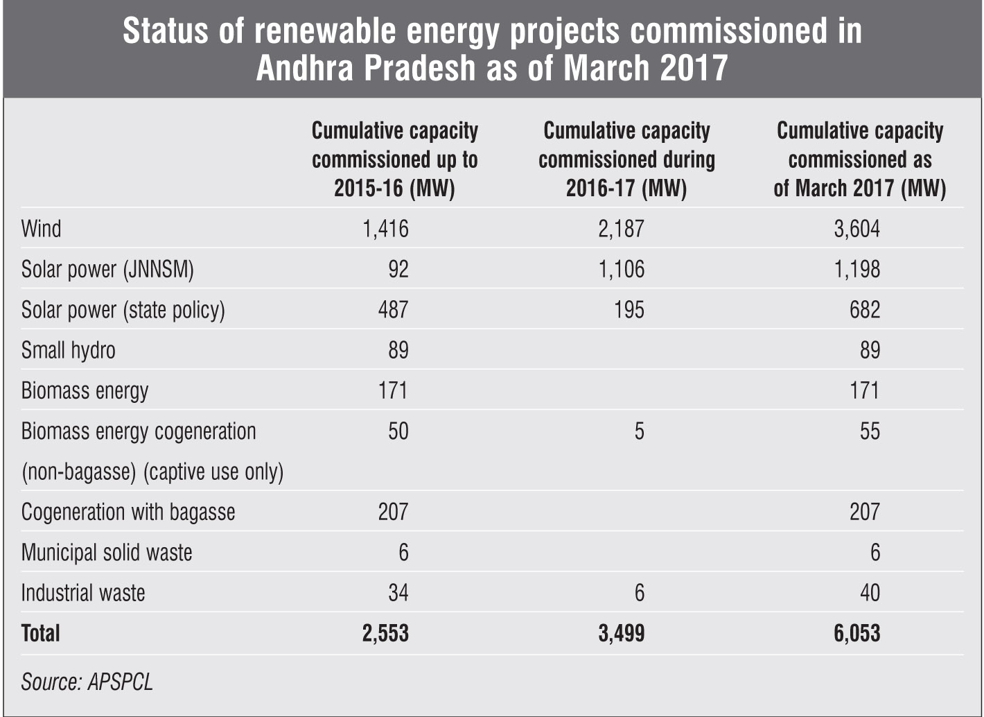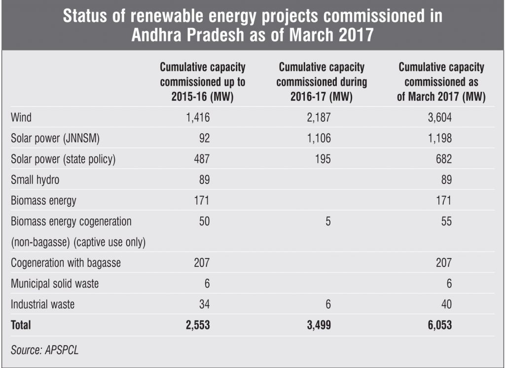 This attractive growth rate is mainly attributed to the investor-friendly environment offered by the state government under its separate policies for solar, wind, hybrid and waste-to-energy projects. Under these, the state offers single-window clearance to facilitate ease-of-doing business and boost investments in the renewable sector. The selection of Andhra Pradesh by the Ministry of Power (MoP) as one of the pilot states for the implementation of the Power for All scheme is also helping attract investment in the conventional power segment by strengthening the financial viability of its discoms. Under this, in 2015, the MoP and the Andhra Pradesh government signed an MoU, along with the state’s two power discoms, Eastern Power Distribution Company of Andhra Pradesh Limited (APEPDCL) and Southern Power Distribution Company of Andhra Pradesh Limited (APSPDCL), to relieve their financial stress. The financial turnaround of the state discoms is helping them gain the trust of investors. In addition, the state’s limited conventional power resources and industrial development are providing the required push to the renewable energy sector in the state.
