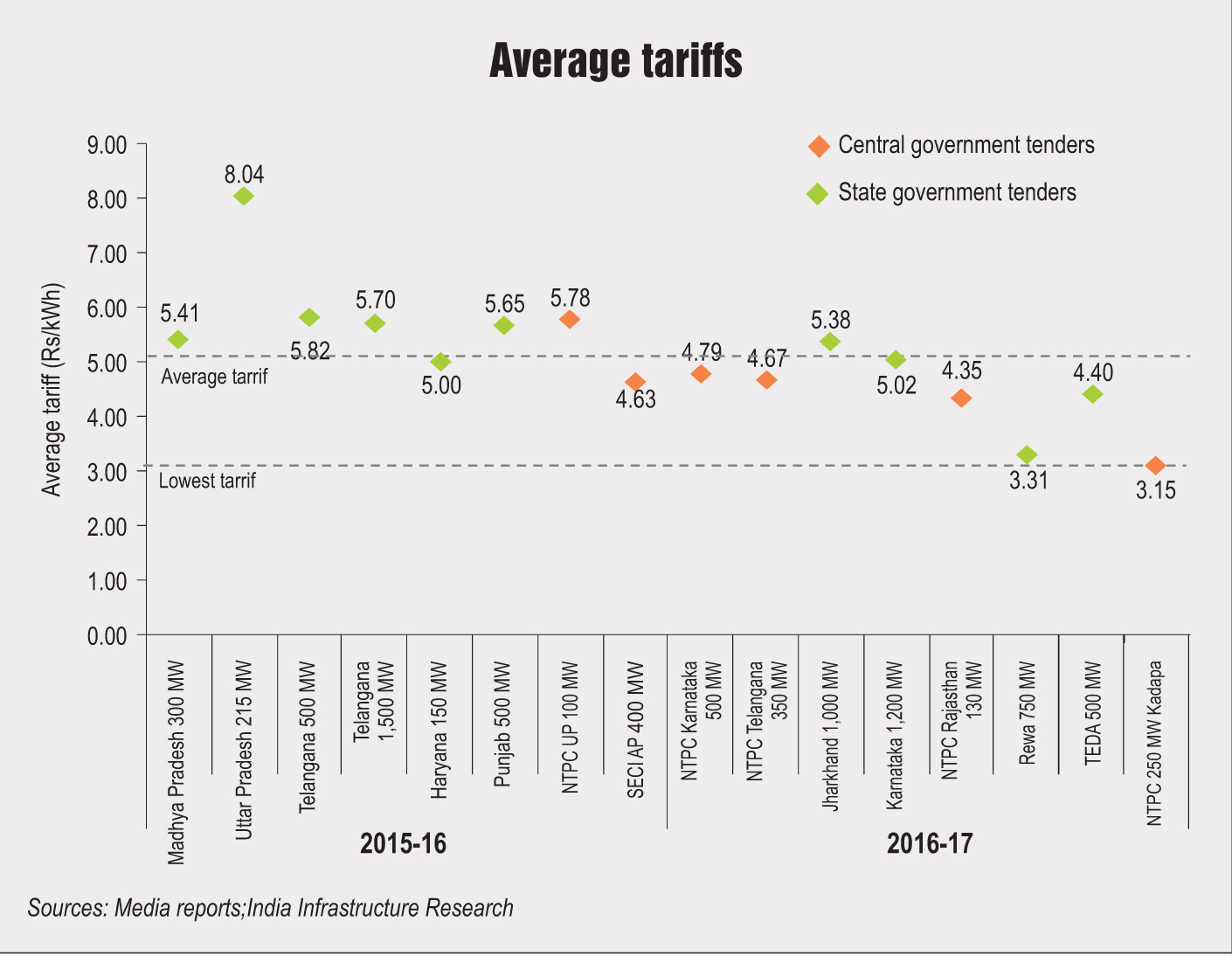 In 2016-17, the gap between the state and central tender tariffs seems to have narrowed. While NTPC’s 500 MW Karnataka tender fetched tariffs of Rs 4.79 per kWh, the state tender in Karnataka received average bids of Rs 5.02 per kWh. NTPC’s Telangana (350 MW) and Rajasthan (130 MW) projects saw average tariffs falling to Rs 4.67 per kWh and Rs 4.35 per kWh respectively. On the other hand, the 1,000 MW Jharkhand state tender attracted bids of Rs 5.38 per kWh. The pattern of state tenders recording higher bids than central tenders has, however, remained intact until now.