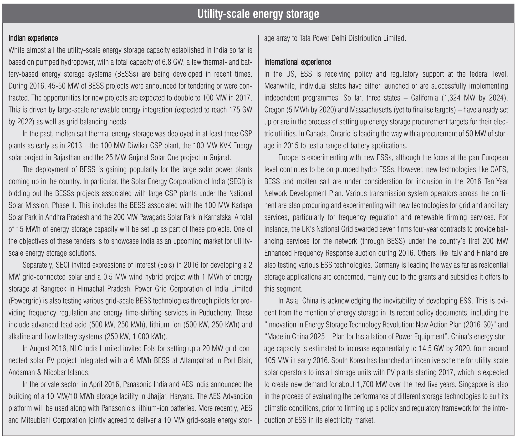 Awell-defined policy and regulatory framework to support energy storage is so far absent in India. However, a handful of grid-connected energy storage projects (other than pumped hydropower storage) have been awarded over the past year or so or are being bid out (see box). The first step to put in place a regulatory framework for energy storage systmes (ESS) has been taken by the Central Electricity Regulatory Commission (CERC) issuing a staff paper, “Introduction of Electricity Storage System in India”, in January 2017. The paper covers the probable grid-level applications of ESS, operational framework and recovery of electricity storage services in detail, and is open for stakeholder comments until March 6, 2017.