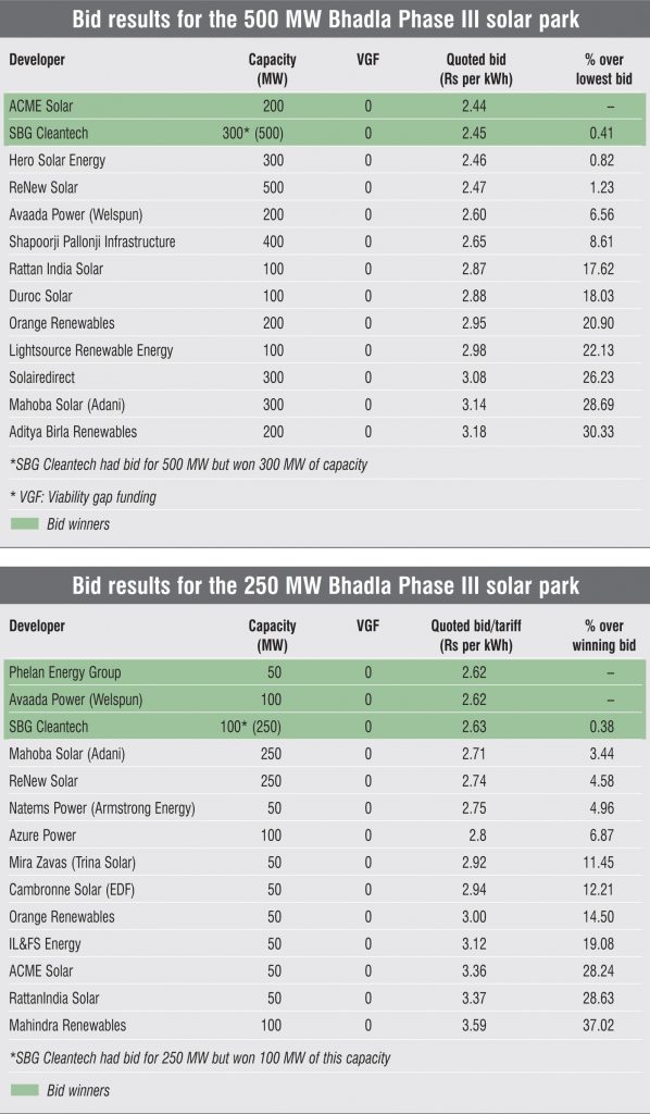 The second big winner, SBG Cleantech, won a 100 MW project in the Bhadla Solar Park Phase-IV auction at Rs 2.63 per kWh and a 300 MW project in the Bhadla Solar Park Phase-III auction at Rs 2.45 per kWh, a 7 per cent difference. SBG Cleantech is a joint venture of the SoftBank Group, Foxconn Technology and Bharti Enterprises, and has access to low-cost funds from SoftBank. The venture was set up in June 2015 after SoftBank’s Masayoshi Son pledged to invest at least $20 billion in solar energy projects in India.