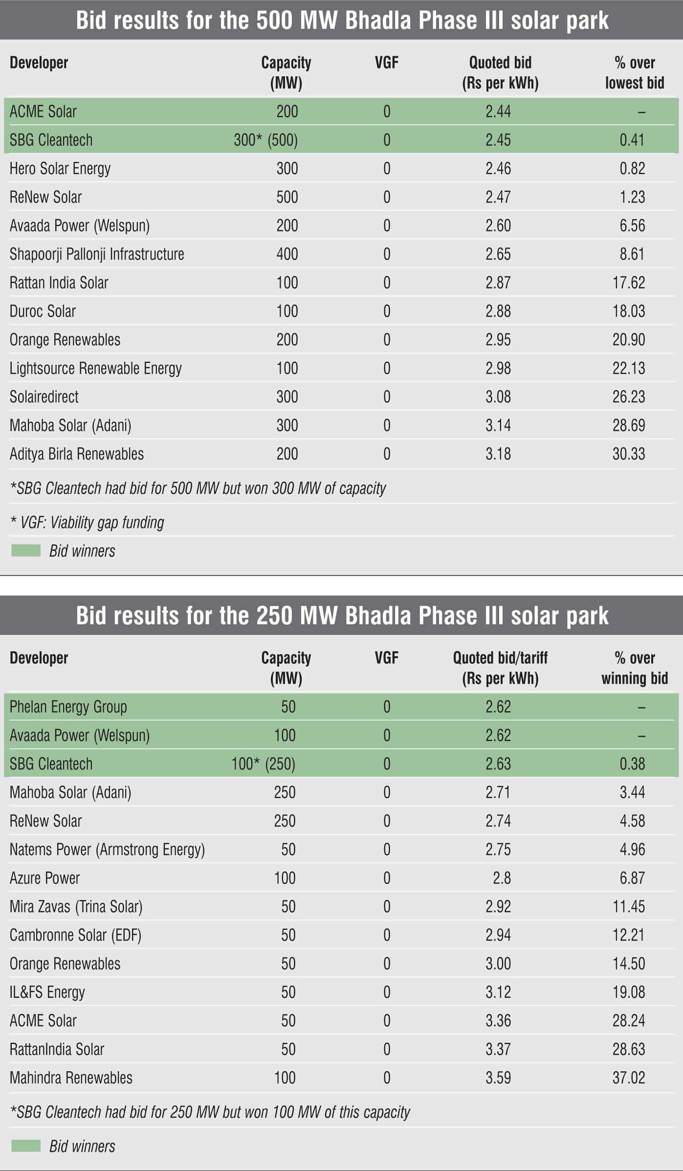 The second big winner, SBG Cleantech, won a 100 MW project in the Bhadla Solar Park Phase-IV auction at Rs 2.63 per kWh and a 300 MW project in the Bhadla Solar Park Phase-III auction at Rs 2.45 per kWh, a 7 per cent difference. SBG Cleantech is a joint venture of the SoftBank Group, Foxconn Technology and Bharti Enterprises, and has access to low-cost funds from SoftBank. The venture was set up in June 2015 after SoftBank’s Masayoshi Son pledged to invest at least $20 billion in solar energy projects in India.