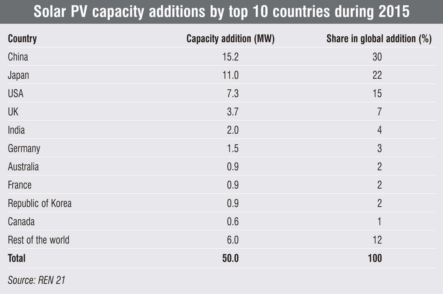 With the growing focus on renewable energy, the power sector across the world is currently undergoing transformation, moving from conventional to alternative sources of energy. In some countries, the annual renewable capacity addition has surpassed that of conventional energy, indicating a shift in policies and investments in favour of renewables. The global solar photovoltaic (PV) market grew considerably in 2015-16 on the back of increased investments in both developed as well as emerging economies. The annual market for new capacity was up by around 25 per cent as compared to 2014, with about 50 GW being added during the year to bring the cumulative solar PV capacity to around 227 GW. The capacity addition is estimated to have involved the installation of about 185 million solar panels. Globalisation continued in the solar PV segment even though about a third of the total capacity addition came from the top three countries – China, Japan and the US.