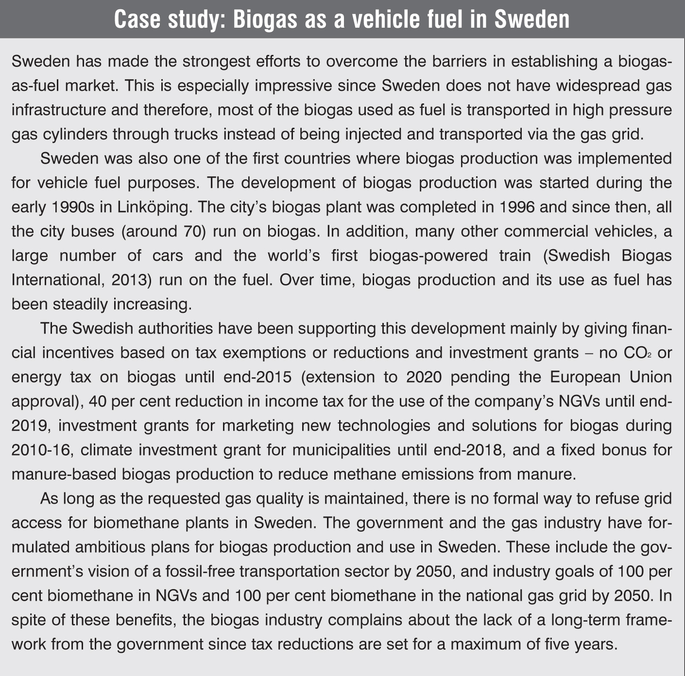 Biogas production for transportation is mainly concentrated in Europe, especially in Sweden, Switzerland, the Netherlands and Germany. However, many countries have significant potential in terms of both biomass availability and NGV infrastructure.