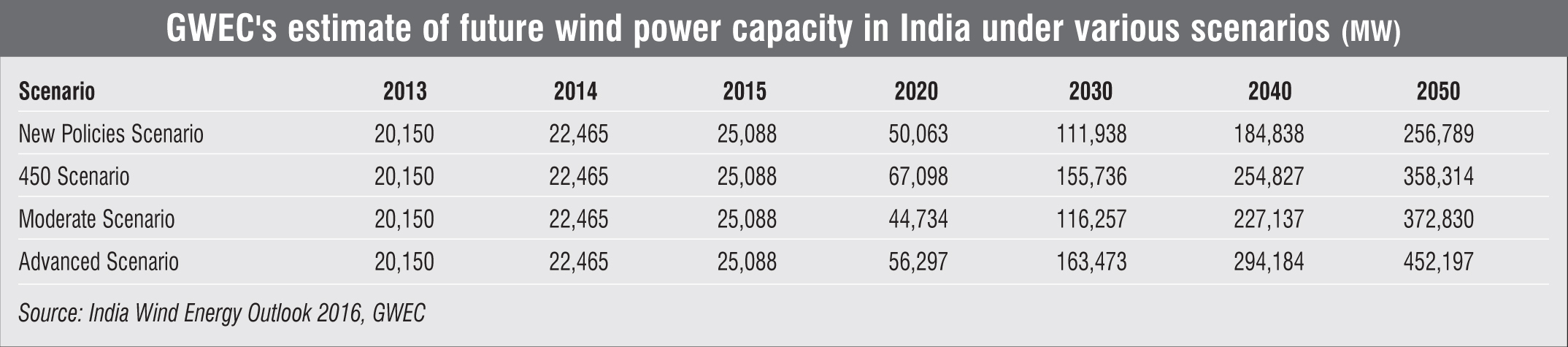 India’s current installations are on a path towards meeting the GWEC’s Advanced Scenario projections for 2020. If the current pace of installations is sustained over the medium term, the total installed capacity would cross the 300 GW mark by 2040. Wind power can provide the much-needed cheap alternative for meeting India’s development and environment goals.