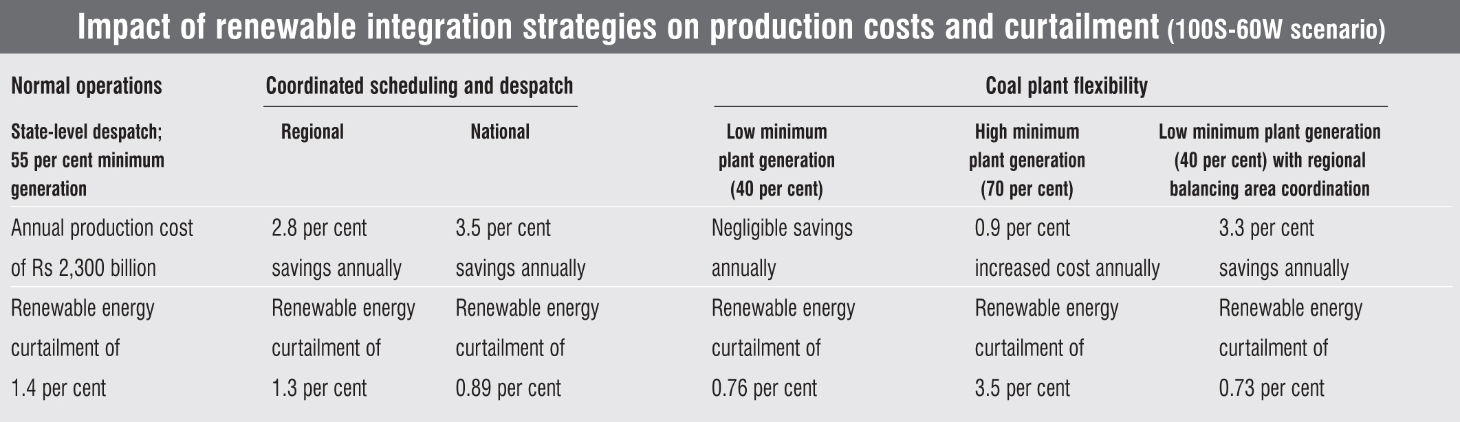 - Changes to operational practices can reduce the operating costs of a power system and bring down renewable curtailment, but are not essential for integrating 160 GW of renewable energy. Scheduling and despatch that is optimised at the regional level rather than at the state level can increase the efficiency of thermal power plant operations and reduce annual operating costs by 2.8 per cent, or Rs 63 billion (approximately $980 million). In addition to improving access to least-cost generation, coordination amongst states helps reduce the number of coal plants at part load, providing a greater operational range to the remaining committed coal plants to lower their generation output when renewable energy generation is high. National coordination further increases cost savings to about 3.5 per cent and reduces curtailment of renewable power to 0.9 per cent.