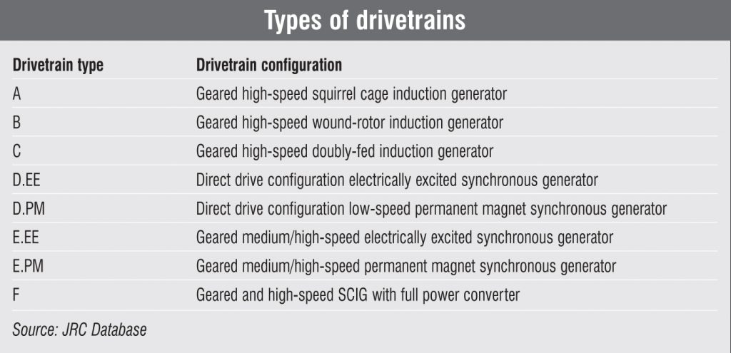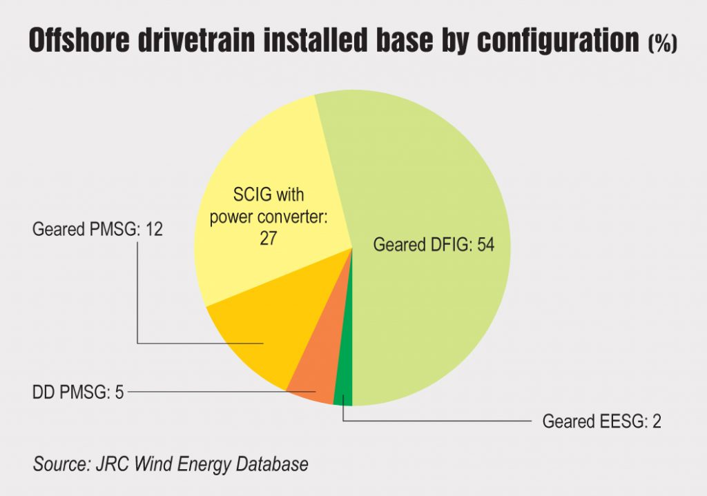Geared and high-speed DFIGs are by far the most dominant configuration in the drivetrain market, accounting for 58 per cent of the total onshore capacity. The market leaders in the DFIG configuration are GE with almost 20.7 per cent market share, followed by Vestas and Gamesa with 19 per cent each.