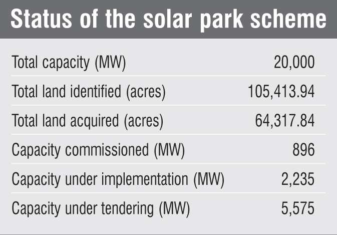 Under the solar park scheme, 34 solar parks with a cumulative capacity of 20,000 MW have been sanctioned in 21 states. The total land identified for setting up these solar projects is 105,413.94 acres, of which 64,317.84 acres has been acquired so far. The total project capacity commissioned under this scheme so far is 896 MW, while another 2,235 MW of solar capacity is under implementation, and around 5,575 MW of capacity is under tendering. SECI is engaged in the development of six solar parks as a JV partner with the state governments of Andhra Pradesh, Himachal Pradesh, Karnataka, Madhya Pradesh, Kerala and Uttar Pradesh. The total solar park capacity sanctioned in these states is 10,550 MW.