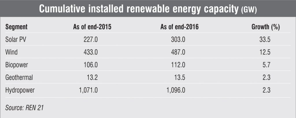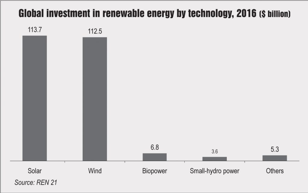 About 161 GW of renewable energy capacity was added in 2016, growing by nearly 9 per cent over 2015 and setting a new global record. Of this, 47 per cent of capacity was added in the solar photovoltaic (PV) segment alone, followed by 34 per cent of wind and 15.5 per cent of hydropower. This capacity addition entailed an investment of about $249.8 billion, roughly double the investments in the fossil fuel sector. The addition was greater than the combined capacity added for all fossil fuels in 2016. However, investments fell by about 23 per cent as compared to those in 2015, largely due to the slowdown in the Chinese and Japanese markets.
