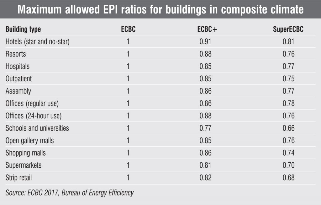 The energy performance index (EPI) calculated as the division of the annual energy consumption in per unit of power (kWh) by the difference between the total built area and the up area (EPI = annual energy consumption [kWh]/(total built area – up area]) is the determining factor for compliance. Exact compliance by a building is calculated as the EPI ratio, which is essentially the ratio of the EPI of the proposed building and that of the standard building. The proposed building here is defined as an entity that is consistent with the design of the building and complies with all mandatory ECBC requirements. According to the EPI ratios, three compliance levels have been defined (see Table).