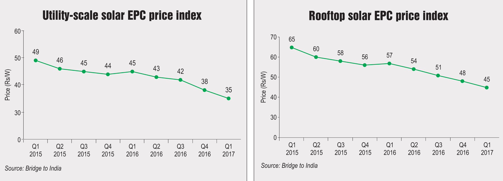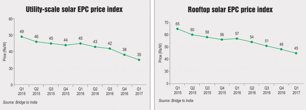 According to BRIDGE TO INDIA, EPC prices for the utility-scale solar market fell by about 8 per cent in the first quarter of 2017 from the fourth quarter of 2016 and 22 per cent year on year in 2016-17 over 2015-16. Over the past two years, solar EPC prices have declined at a compound annual growth rate of 8.7 per cent, from Rs 49 per watt in the first quarter of 2015 to Rs 35 per watt in the corresponding quarter in 2017. Meanwhile, in the rooftop EPC market, while the annual decline stood at 27 per cent, the quarterly decline was only 6 per cent. The prices fell from Rs 65 per watt in the first quarter of 2015 to Rs 45 in the same quarter of 2017, indicating a decline of 9 per cent compounded annually. In the first quarter of 2016, solar rooftop EPC prices increased by Re 1 per watt over the previous quarter due to multiple reasons. Since then, the prices have been falling consistently by Rs 3 per watt per quarter in 2016.