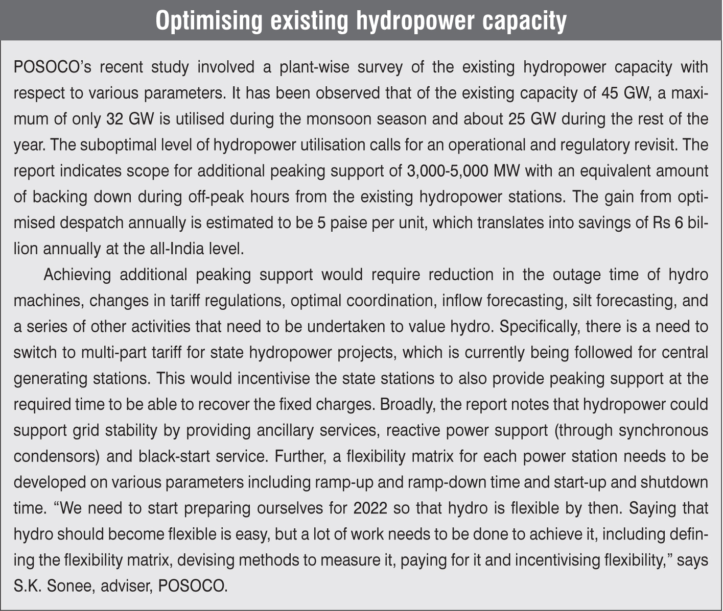 At present, India has nine PSPs with an installed capacity of 4,786 MW. Of these, only five PSPs aggregating 2,600 MW are working in pumping mode. Recognising the importance of PSPs to support the integration of renewable energy, the Central Electricity Authority (CEA), in June 2017, held a meeting with the concerned stakeholders for operationalisation of existing PSPs. These stakeholders highlighted the existing status of PSPs in the country and the issues and challenges, as well as made recommendations to resolve them. Reviving PSPs is complementary to the larger effort of optimising the existing 45 GW hydropower capacity in the country to provide peaking and other services to the grid. To this end, the Power System Operation Corporation of India (POSOCO) has undertaken a study on “Operational Analysis for Optimisation of Hydro Resources and Facilitating Renewable Integration in India” (see box).