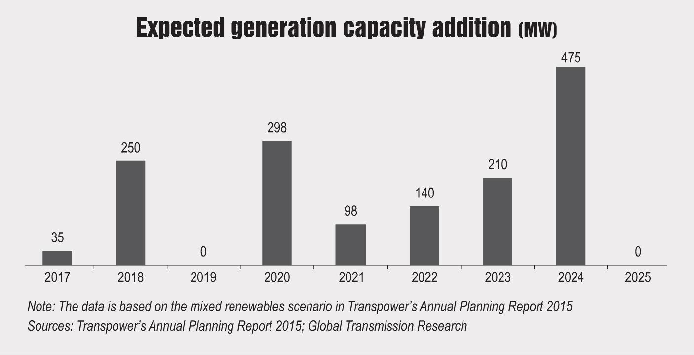 During 2016, renewable generation increased largely due to favourable hydrological conditions, grid and generation investments and the decommissioning of the Southdown and Otahuhu thermal plants at the end of 2015. According to Transpower’s Annual Planning Report 2015 (Mixed Renewables Scenario), about 583 MW of new capacity is expected to be connected to the grid between 2016 and 2020. Another 923 MW is likely to be developed over the following five-year period. Some of the major planned projects are the Tauhara geothermal project Stage II (200 MW), the Turitea wind project (183 MW), the Wairau hydro project (70 MW), the Hawke’s Bay wind farm (65 MW) and Todd Energy’s gas plant (100 MW).