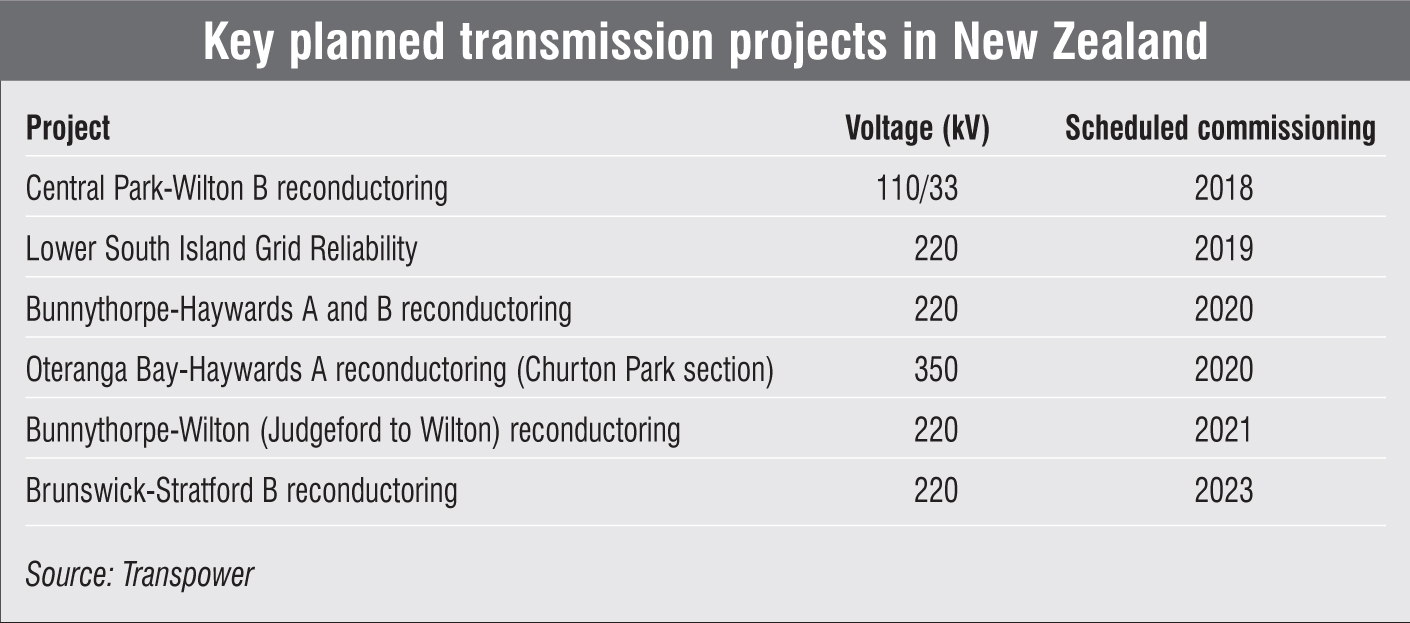 Another major project being implemented is the 350 kV Oteranga Bay-Haywards A reconductoring (Churton Park section) project, at a cost of NZD 28 million. The scope of work includes the replacement of conductors on the Churton Park section of the Oteranga Bay-Haywards A line. This line forms a part of the HVDC link between Benmore in the South Island and Haywards in the North Island. The project is scheduled to be completed by 2020. Some of the other key projects to be undertaken are the 110/33 kV Central Park-Wilton B, the 220 kV Bunnythorpe-Wilton (Judgeford to Wilton) and the 220 kV Brunswick-Stratford B reconductoring projects, all of which are scheduled to be commissioned by 2020-23.