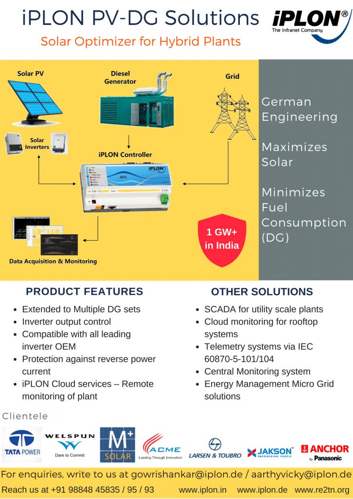 iPLON has launched a photovoltaic (PV)-diesel generator (DG) hybrid fuel save controller. The controller acts as an interface connecting the DG, the PV system and the load, thereby managing the need-based PV feed-in power according to the load and generation profiles of the system. Although iPLON’s fuel save controller is ideal for a plant with one DG set, it can be extended to include over 10 DG sets. The key features of the system are: