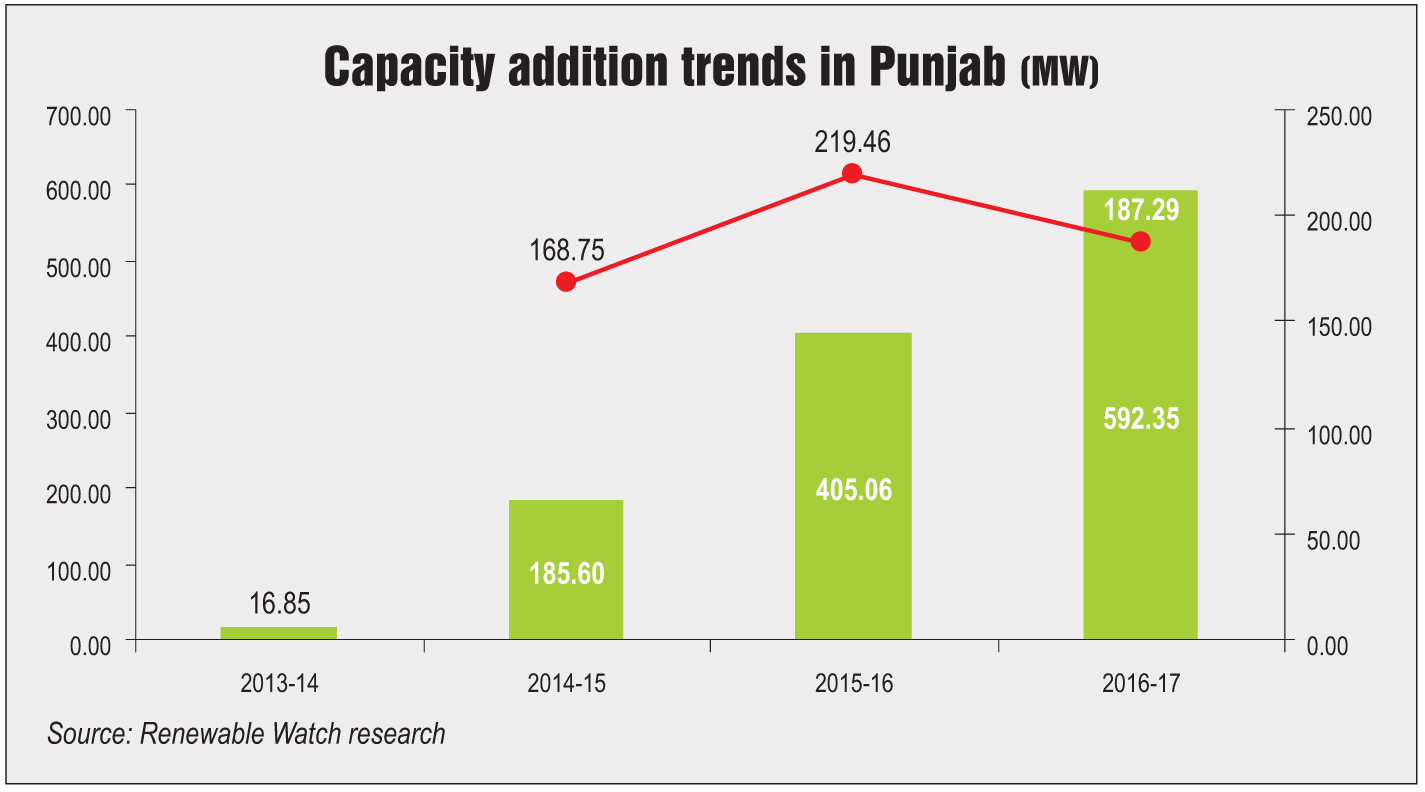 Capacity addition in the state’s rooftop solar segment is yet to gain momentum. As of March 31, 2017, Punjab had an installed rooftop solar capacity of 66 MW, or 8 per cent of the total solar capacity. The commercial sector occupied the largest share with 73 per cent, followed by the industrial and public sectors at 15 per cent and 12 per cent respectively.