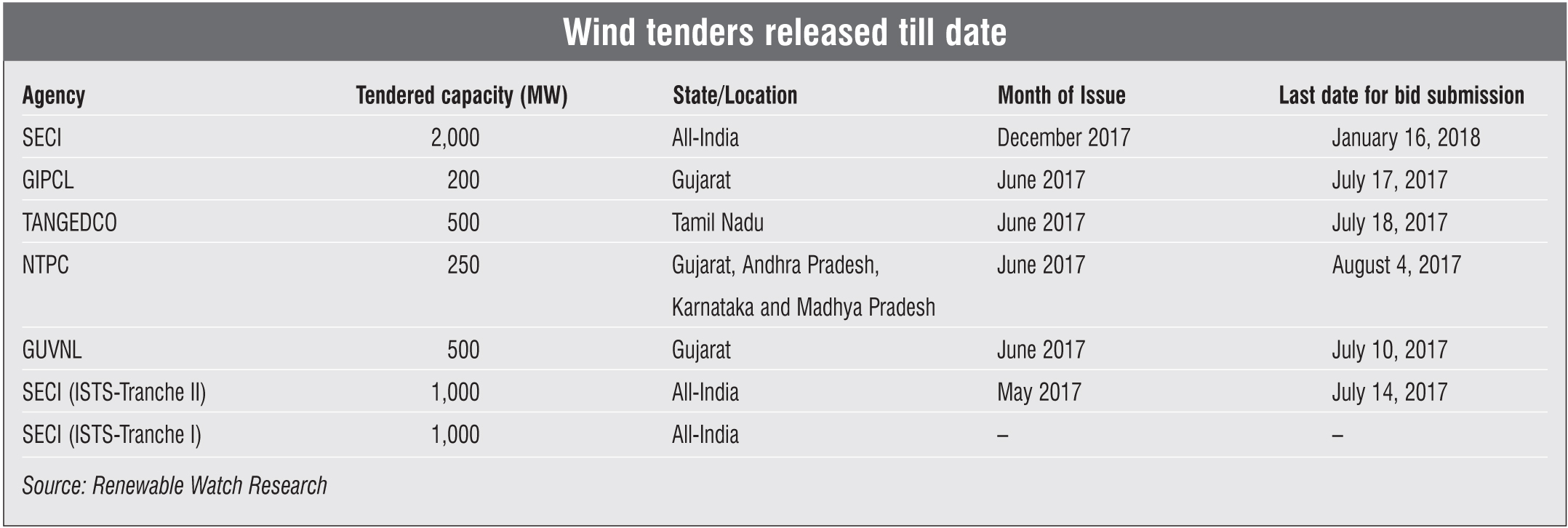 Following the shift from feed-in tariffs (FiTs) to competitive bidding in early 2017, the wind power segment has largely been supported by central government auctions. The Solar Energy Corporation of India (SECI) has so far tendered two lots of wind power projects of 1 GW each in February and September respectively. Apart from this, only two states – Tamil Nadu and Gujarat – released wind project tenders, but both faced objections from the industry due to the absence of any standard guidelines. This led to a total freeze on any new project allocation in 2017, thus adversely impacting the market and dampening investor confidence.