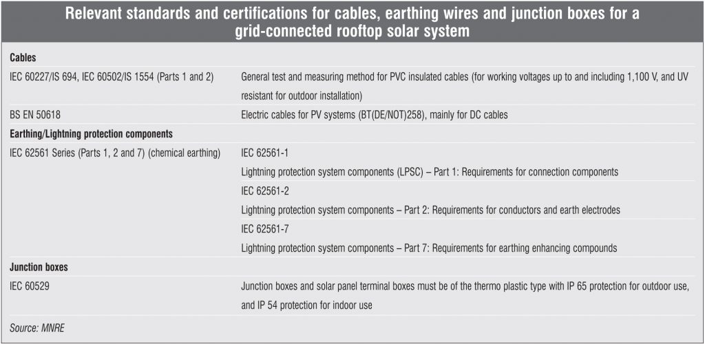 Thus, testing and certification of equipment, especially for rooftop solar projects, is essential. Rooftops are a dangerous place for wires and cables due to a variety of conditions, such as high heat, extreme cold, wind, snow and rain. The potential for damage is multiplied when wires are not well secured. The Ministry of New and Renewable Energy (MNRE) has defined a set of quality certification and standards for all equipment used in grid-connected rooftop solar PV systems. These include a set of guidelines to be followed while choosing and installing cables for a rooftop solar system. The best practices are as follows: