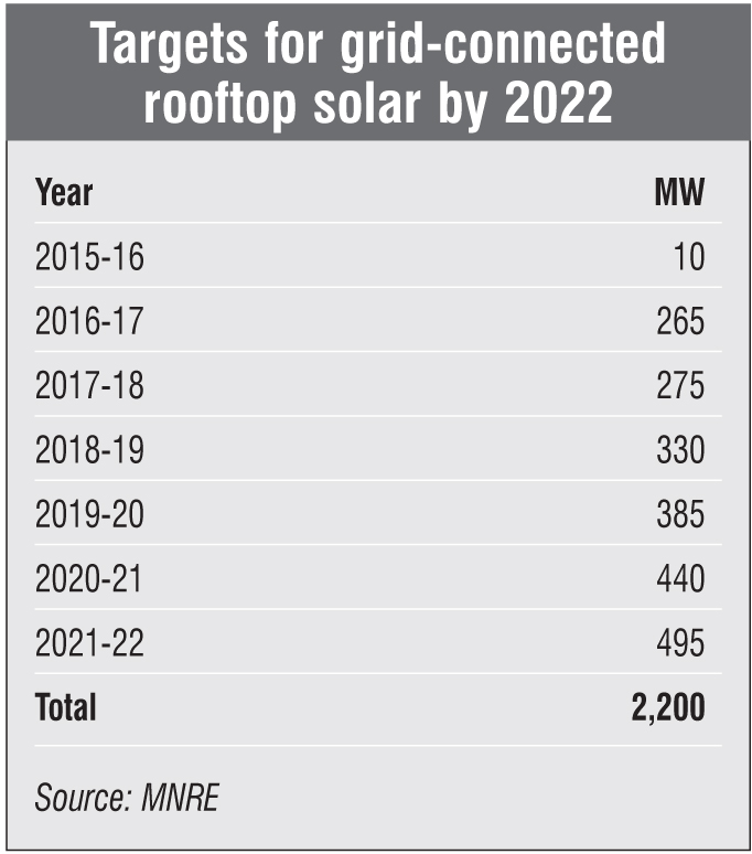 Madhya Pradesh has set a target to install 2,200 MW of rooftop solar power capacity by 2022 out of which it has achieved 13.36 MW as of August 2017. In 2015, a net metering policy was announced under which the state allowed rooftop solar installations up to individual rated capacity of 112 kW (LT) at average power purchase cost.