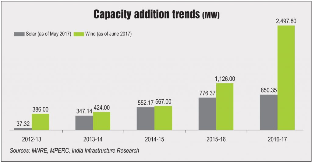 This lull in capacity addition over the past year can be mainly attributed to surplus power in the state, which the discoms’ were unable to procure. Moreover, Madhya Pradesh fulfilled 100 per cent of its renewable purchase obligation (RPO) target in 2016-17. The two factors combined have dissuaded the government from adding more capacity. However, an increase in capacity addition is expected in the coming years as the state has five solar power parks with a combined capacity of 3,000 MW. These solar parks are the Rewa (750 MW); Agar, Rajgarh and Shujalpur (750 MW); Neemuch and Mandsaur (750 MW); Chhattarpur (500 MW) and Morena (250 MW).