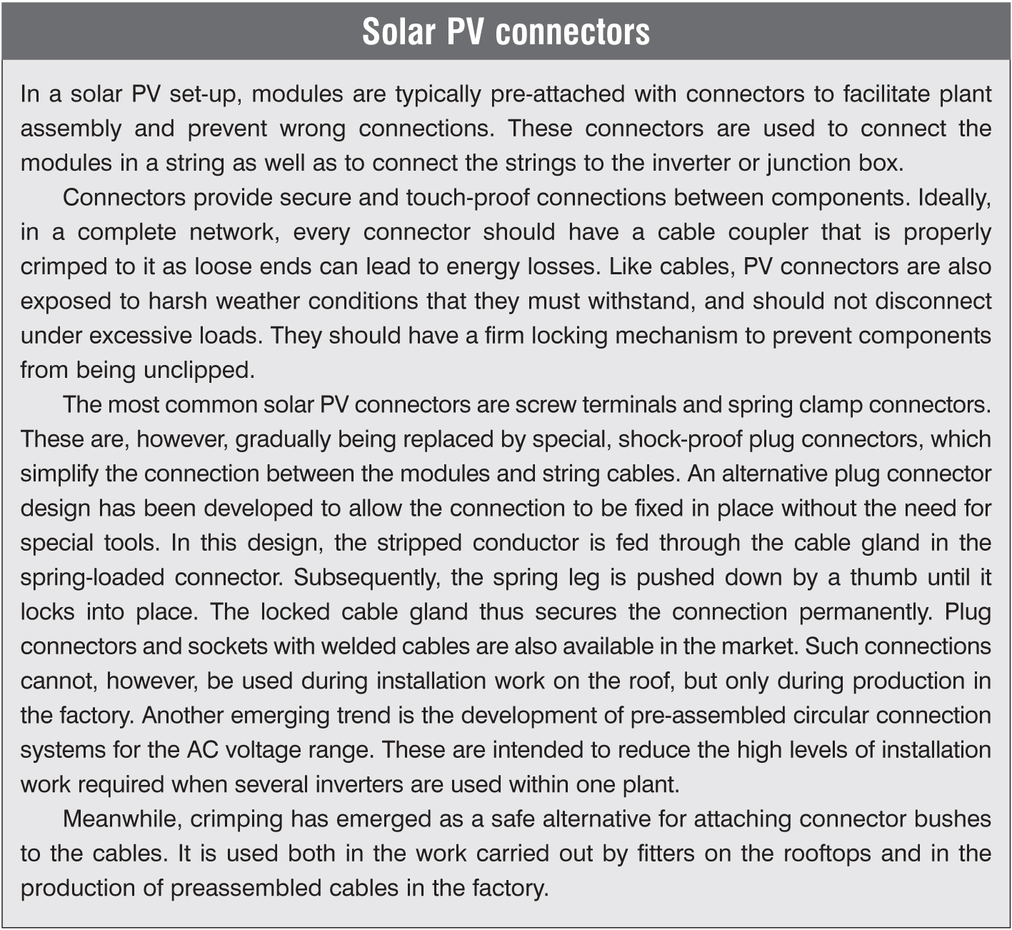 The type of components to be connected also influences the cable size. For instance, module-module connections are usually enabled by connecting the positive and negative plug connector terminals of the cables of preassembled junction boxes. For safety reasons, the positive and negative cables are laid separately. Further, if the length of the cables is not sufficient, then special extension cables are used. On the other hand, battery-inverter connections are enabled by using short and thick cables to reduce system losses, and improve efficiency and reliability. Meanwhile, battery-charge controller connections require cables whose cross-sectional area is in accordance with the maximum current output.