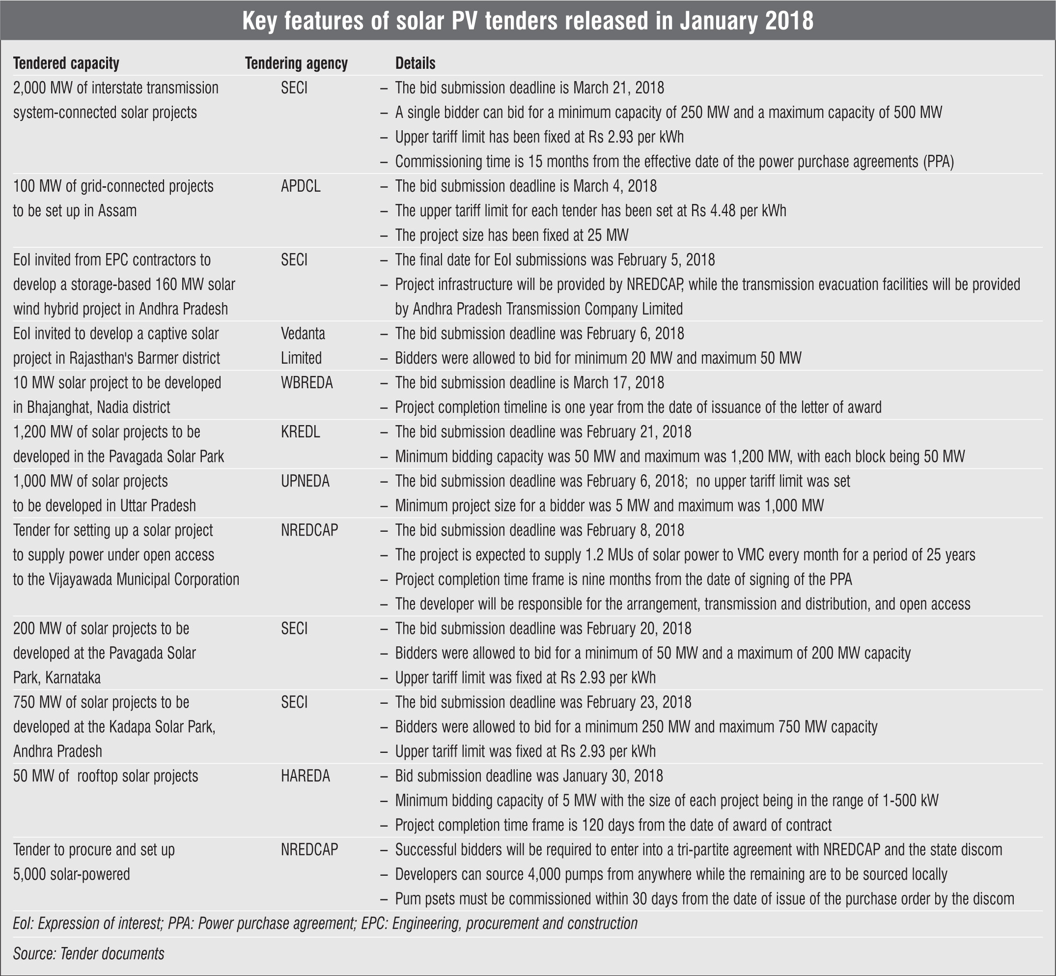 The first month of 2018 witnessed significant activity in the solar power segment, with a series of tenders announced by government agencies and industry players giving further impetus to the country’s clean energy goals. The highest grid-connected solar photovoltaic (PV) capacity was tendered by the Solar Energy Corporation of India (SECI). For the first time, a solar power project tender was issued by Assam Power Distribution Company Limited (APDCL). Meanwhile, Haryana continued to be strong in the rooftop solar segment as it released another tender for 50 MW of rooftop solar capacity to be set up in the state. The New and Renewable Energy Development Corporation of Andhra Pradesh (NREDCAP) also released a tender for the installation of 5,000 solar pumps. The following table summarises the key solar tenders released by various agencies and companies in January 2018.