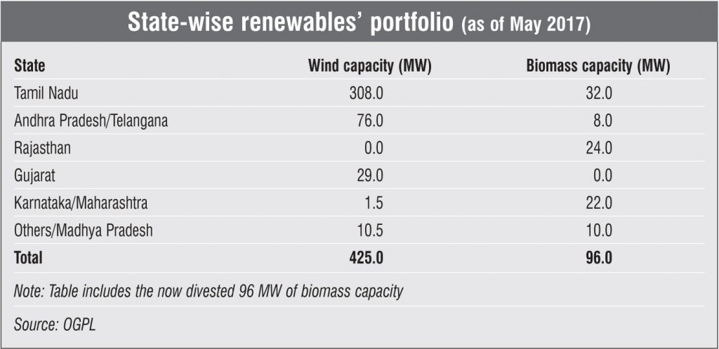 Upon completion of the entire demerger, OGPL will operate only as a wind power company. Its wind power project portfolio comprises a 29.2 MW plant in Gujarat, with a 25-year long-term power purchase agreement (PPA) at Rs 4.15 per kWh, and a 50.4 MW plant in Andhra Pradesh with a 25-year long-term PPA at Rs 4.70 per kWh. Both projects receive a generation-based incentive of Re 0.50 per kWh each. The company’s largest wind farm with a capacity of 308.28 MW is located in Tamil Nadu and based on a group captive model. Constituting 74.5 per cent of OGPL’s total portfolio, the plant has an average price realisation of Rs 5.5 per kWh.