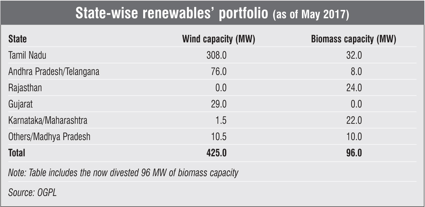 Upon completion of the entire demerger, OGPL will operate only as a wind power company. Its wind power project portfolio comprises a 29.2 MW plant in Gujarat, with a 25-year long-term power purchase agreement (PPA) at Rs 4.15 per kWh, and a 50.4 MW plant in Andhra Pradesh with a 25-year long-term PPA at Rs 4.70 per kWh. Both projects receive a generation-based incentive of Re 0.50 per kWh each. The company’s largest wind farm with a capacity of 308.28 MW is located in Tamil Nadu and based on a group captive model. Constituting 74.5 per cent of OGPL’s total portfolio, the plant has an average price realisation of Rs 5.5 per kWh.