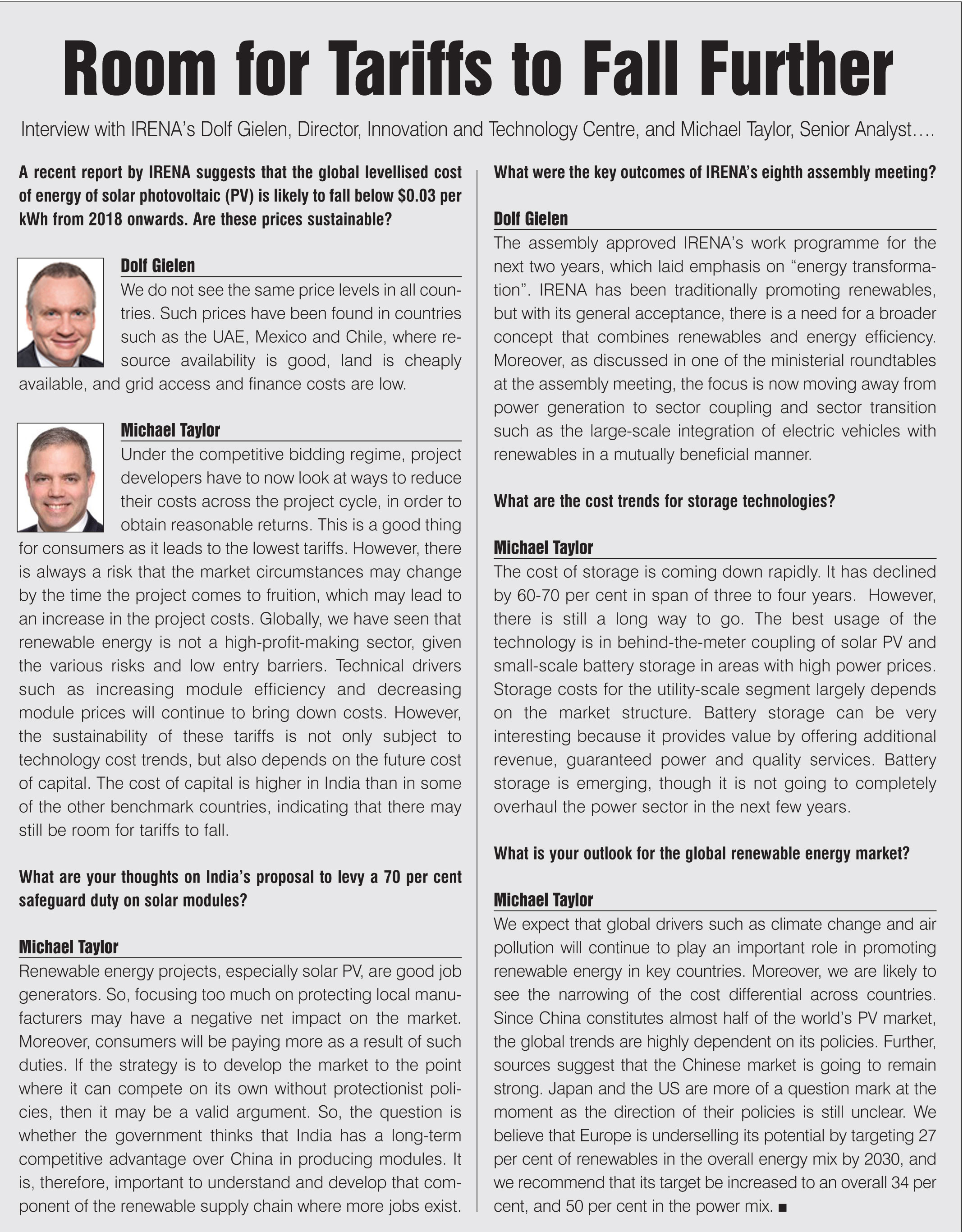 According to IRENA’s analysis, there are three primary drivers responsible for the cost reduction – technology improvements, competitive procurement and the emergence of large international developers. Technological improvements in wind and solar have led to significant cost reductions as well as increased installations. The wind power segment has benefited from bigger wind turbines with higher hub heights, while new solar cells have achieved unprecedented efficiencies. Meanwhile, real-time updates and big data have enhanced predictive maintenance and reduced downtime, thereby lowering operations and maintenance costs. As technologies become mature, the risks associated with them diminish, increasing investor interest and reducing the cost of capital. Further, many countries including India are opting for competitive bidding as a means of tariff determination and project allocation. Also, large international developers with deep pockets and insatiable appetites are entering the renewables’ space, bringing their global experience to blooming markets along with international capital at low costs.