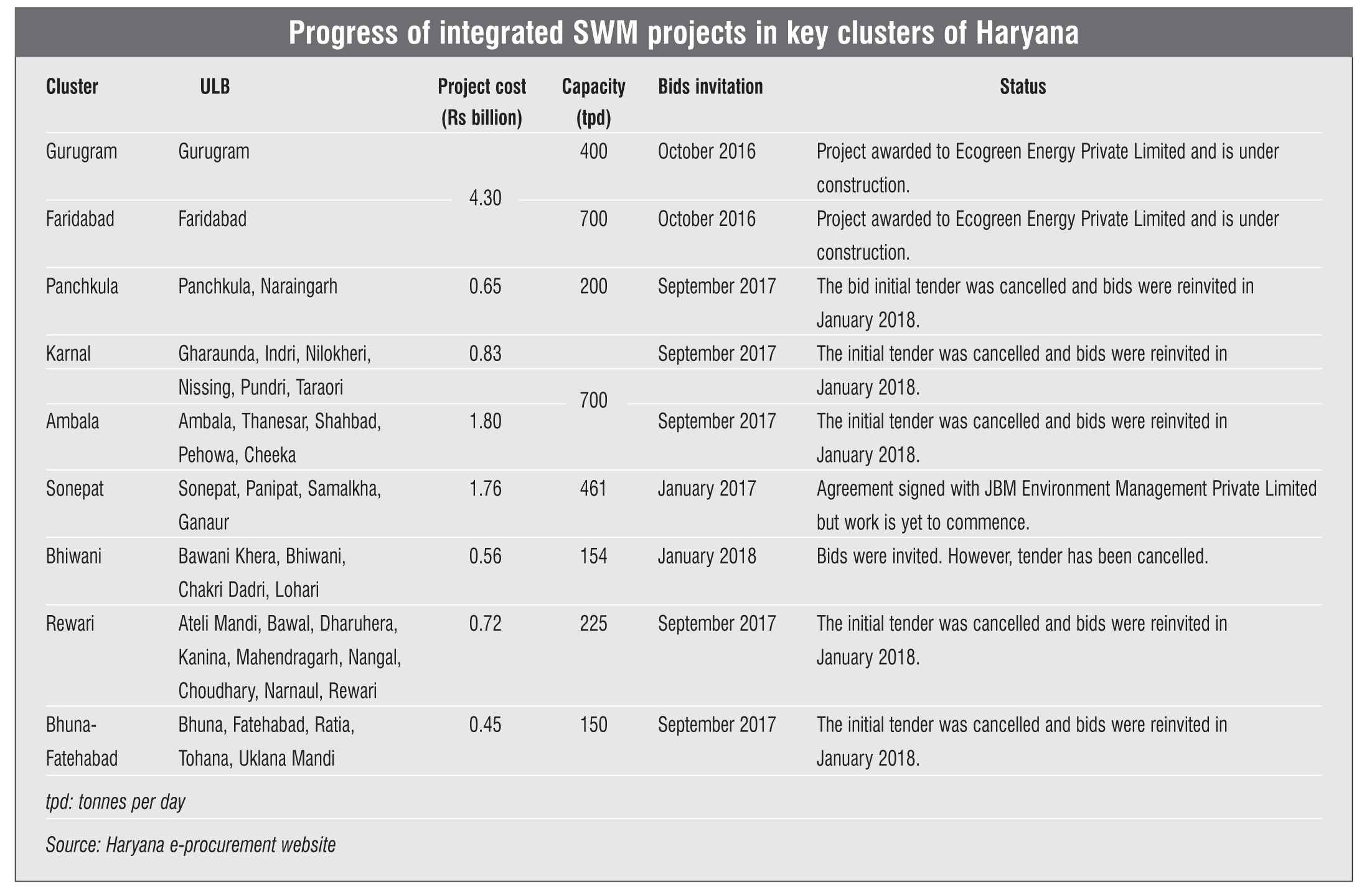 With respect to the Bhiwani cluster, in January 2018, bids were invited to develop a waste-to-compost plant with a capacity of 154 tpd. However, this has been cancelled and no further update is available on the project. Bids for the remaining clusters (Rohtak, Yamunanagar, Hissar, Punhana, Dabwali and Jind) are yet to be invited.