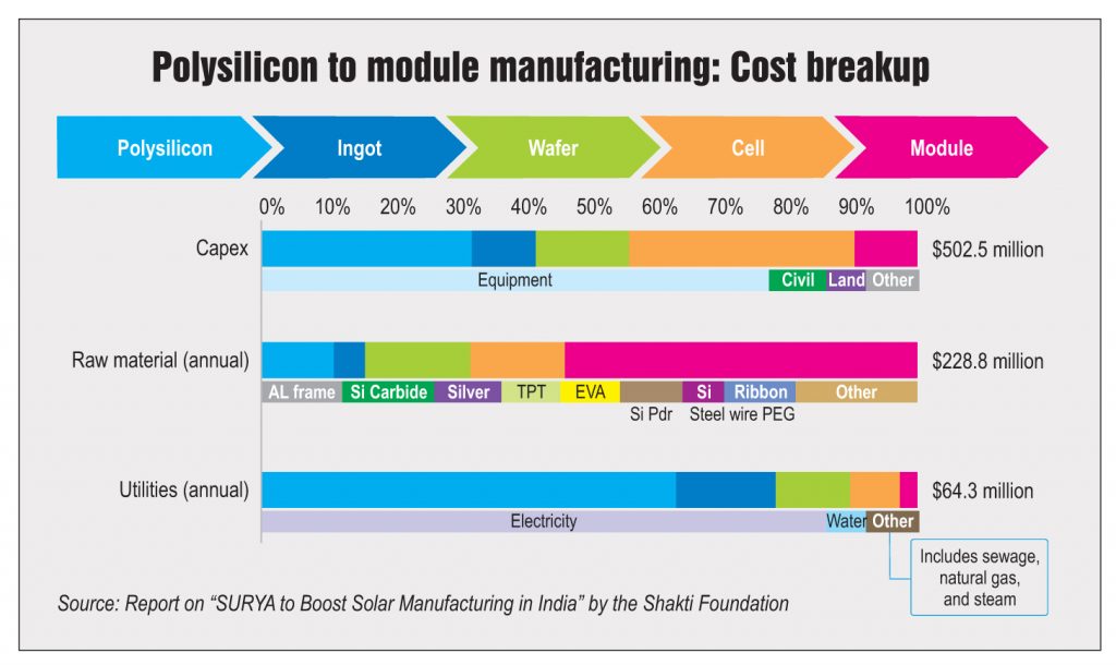 The study has been carried out for a fully integrated multi-GW plant scaled down to 1 GW, assuming that 7.5 per cent basic import duty and 18 per cent countervailing duty are applicable on plant and machinery. The cost per GW is defined for the entire process of manufacturing modules from polysilicon. Typically, manufacturers start by setting up module manufacturing first and then trace the path vertically backwards.
