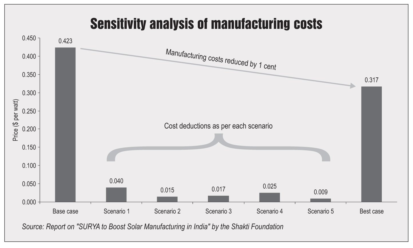 Based on the analysis, the report found that the cost of electricity and production subsidies impacts solar manufacturing costs in the country the most. In the best -case scenario, wherein all duties are waived and all subsidies are provided to the manufacturing unit, the difference in costs is about $0.1 per watt.