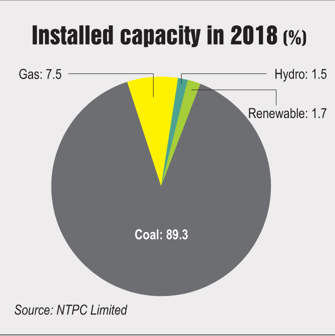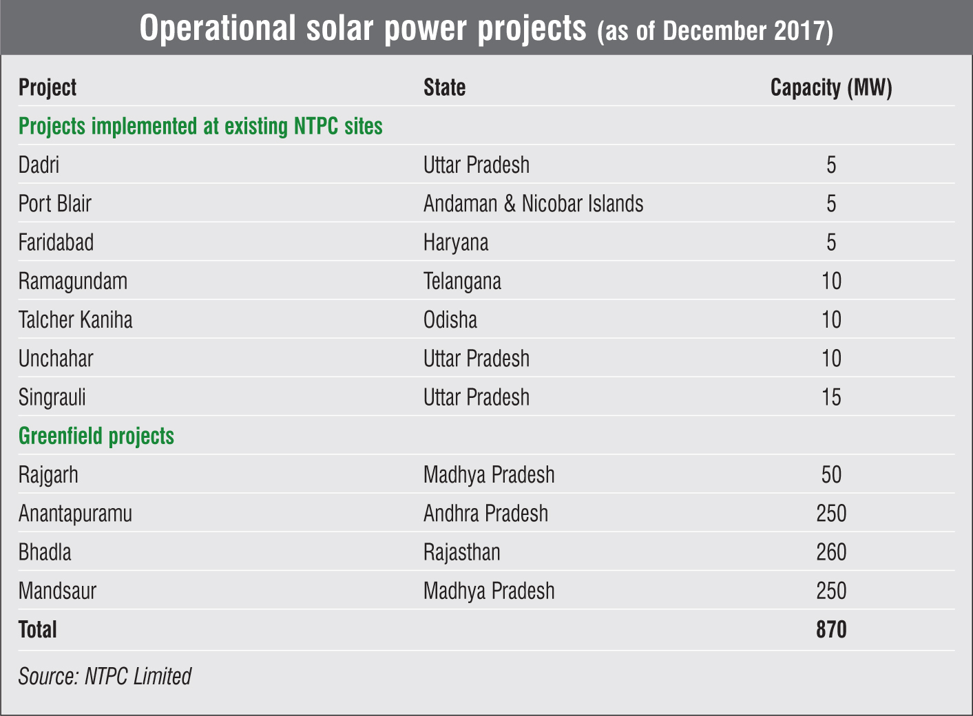 NTPC Limited is making rapid strides in the renewables space to meet its green energy commitment. As of March 2018, NTPC’s total installed generation capacity stood at 53.6 GW, of which 870 MW was solar and 50 MW was wind. Apart from setting up its own fleet of solar and wind power projects, NTPC has commissioned over 3,483 MW of capacity in developer mode under the National Solar Mission. In addition, it has set up an 8 MW small-hydro power project at the NTPC Singrauli campus, Uttar Pradesh.