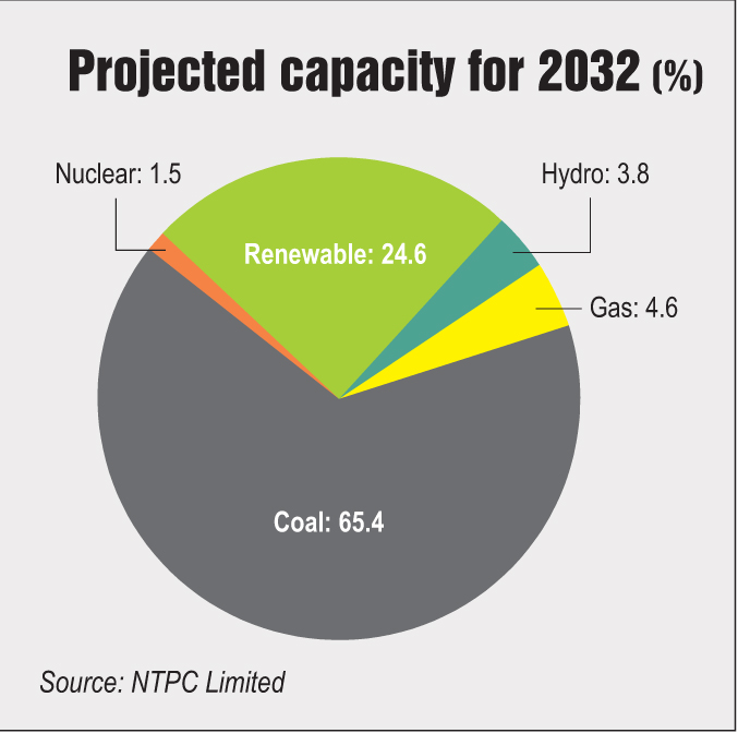 NTPC has announced an ambitious growth plan till the year 2032. It plans to set up about 130 GW of generation capacity, of which 32 GW will come from renewables. Of the 53.6 GW of total installed capacity, only 0.92 GW is from renewable energy sources. Thus, in a span of 14 years, the company aims to increase the share of renewables from 1.7 per cent to 24.7 per cent.