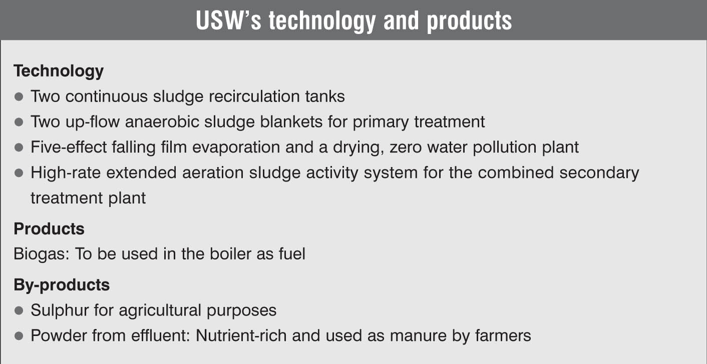 Over the years, USW has installed a bagasse-based cogeneration plant of 44 MW in two to three phases. Of this, 15 MW is used for captive consumption and the balance 28 MW is fed into the state grid. This is the single largest cogeneration plant in the country using non-conventional energy sources, that is, bagasse and other waste. Ugar uses high-pressure boilers from Thyssenkrupp (two boilers of 80 tonnes per hour (tph) of capacity and 62 kg/cm2 pressure with 480°C) and turbines from Siemens and Shin Nippon (Japan). In the first phase, started in 1998, the cogeneration plant produced 18 MW of power, of which 10 MW was exported to the grid. In the second phase, which started in 1999, it produced 28 MW, of which 18 MW was exportable power. Driven by the outcome and in order to crush maximum cane in the peak recovery season, USW, in 2001, decided to expand its sugar factory capacity from 7,500 TCD to 10,000 TCD by adding a larger size milling tandem (42×84 inches), an 80 tph, 62 kg/cm2, 480°C boiler, and a 22.8 MW Shin Nippon back-pressure turbine.