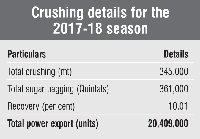 For the environmental management of the sugar, distillery and cogeneration units, the factory has invested around Rs 80 million in setting up a self-monitoring system, a laboratory and modern equipment, etc. Now the company is installing a new effluent treatment plant for distillery spent wash, that is, five-effect falling film evaporator with thermal vapour compression system for zero pollution. The organisation is certified with both ISO 14001 (certification for the best environment management system) and ISO 9001 (certification for the best quality management system).