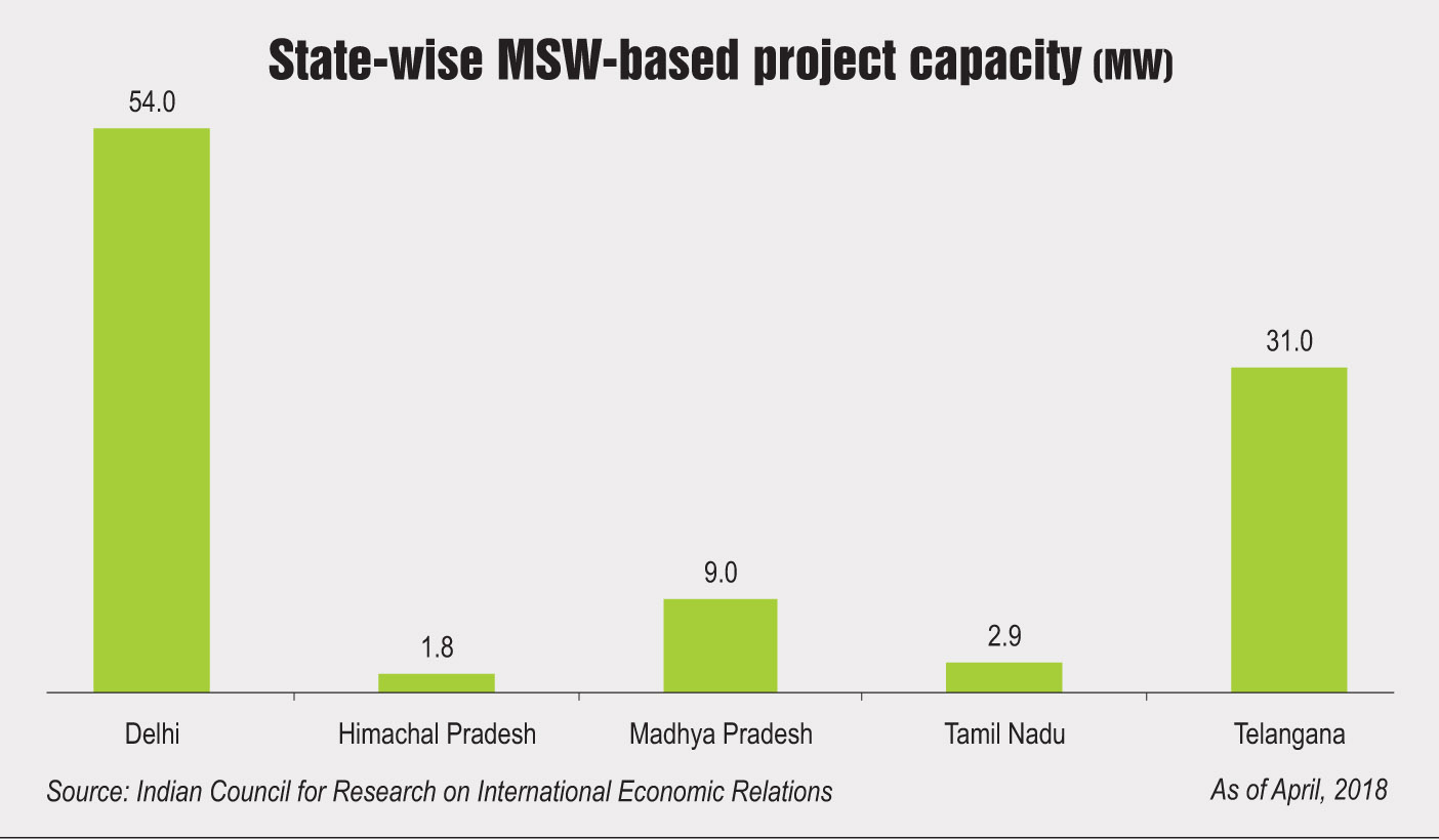 - MSW-based power projects: These projects require MSW to be segregated into refuse-derived fuel (RDF). As of April 2018, there were only eight MSW-based power plants in the country, aggregating a capacity of 98.65 MW. These plants are spread across five states, with Delhi accounting for the highest share of capacity as well as the highest number of plants.