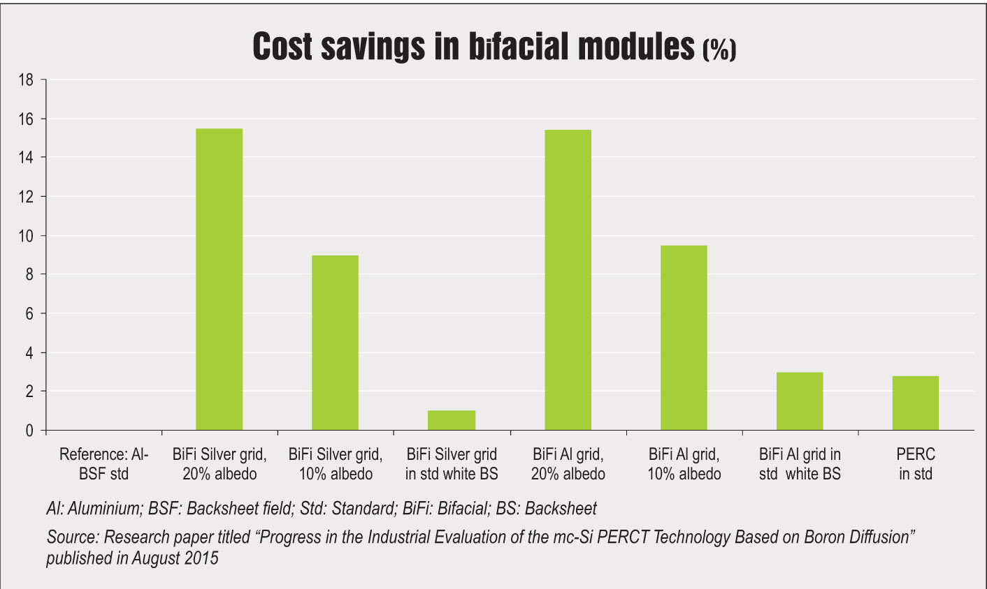 Bifacial modules are gaining prominence slowly, with even tracker manufacturers providing specially designed tracker models for bifacial modules. While the current uptake of bifacial PV cells is quite small, the International Technology Roadmap for PV predicts a 30 per cent market share for these cells by 2027. One of the factors contributing to its popularity could be the fact that almost all advanced cell concepts can be converted into bifacial to increase efficiency gains. In fact, bifacial cells are logical extensions of the already established and proven monocrystalline cell technology.
