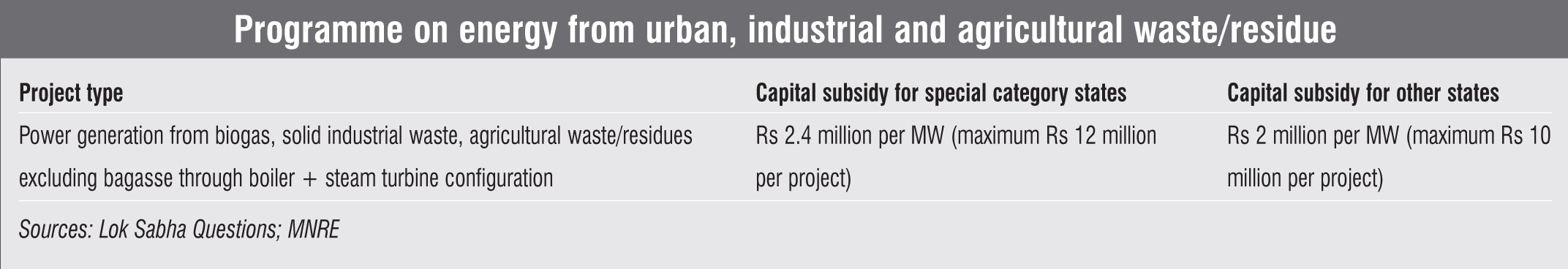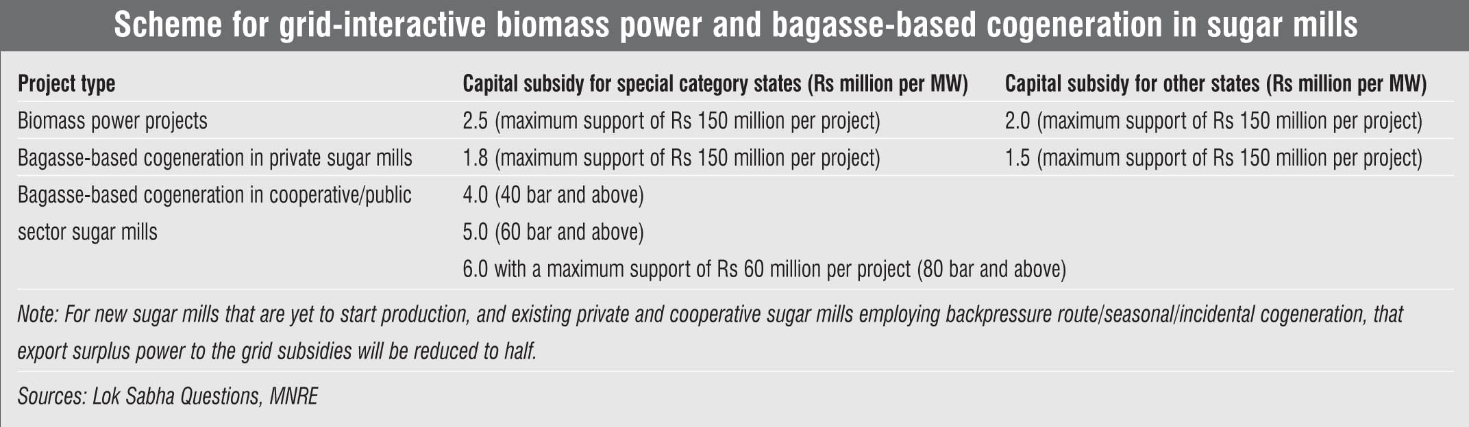 India has about 20,000 MW of biomass potential. In May 2018, the Ministry of New and Renewable Energy (MNRE) announced a programme to support the promotion of biomass-based cogeneration in sugar mills and other industries. Under this, central financial assistance (CFA) will be provided to sugar mills for grid-connected biomass power and bagasse-based cogeneration. Further, the ministry provides CFA of Rs 20 million per MW under its programme on energy from urban, industrial and agricultural waste or residues.