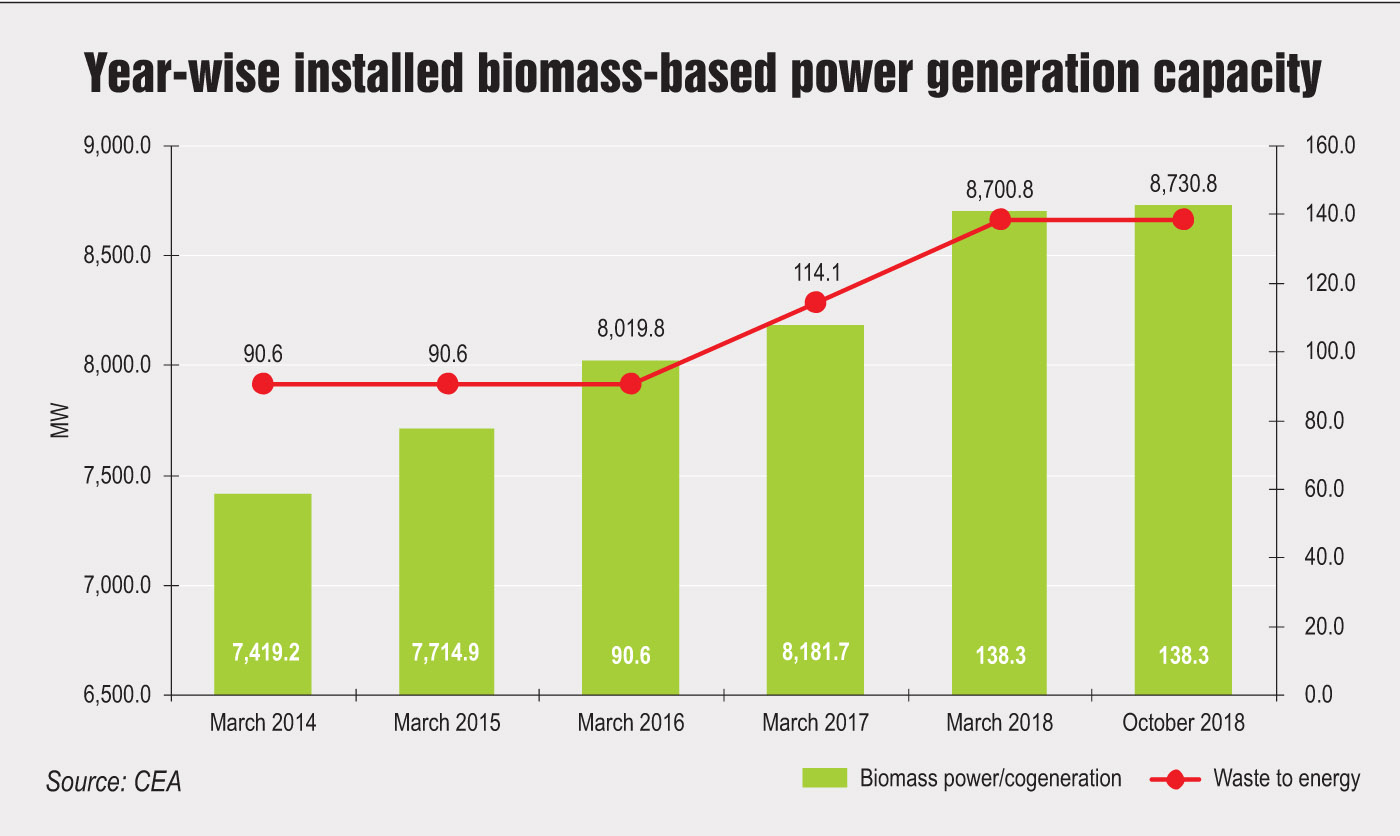 The government has identified the potential and role of bioenergy in the Indian context and initiated several programmes for the promotion of biomass conversion technologies in various sectors. India had set a target to install 1 GW of biomass-based power capacity by 2022. It has already achieved 90 per cent of the target with the installation of 8,869.10 MW of biomass-based power capacity, as of October 2018. In February 2018, the Ministry of Power released a policy mandating the use of 5-10 per cent biomass pellets alongside coal for power generation in thermal power plants across the country. Following this, NTPC Limited rolled out a tender to procure residue-based biomass briquettes for co-firing its coal-based plants.
