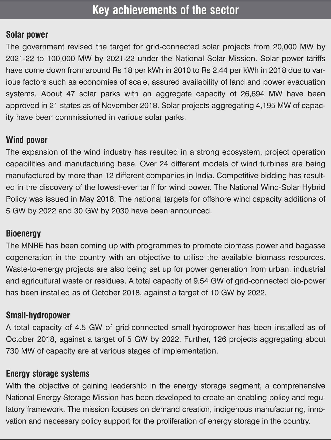The country is well on track to achieve the 175 GW target of installed renewable energy capacity by 2022. Trends suggest that the target will be not only achieved but exceeded since the MNRE is also exploring various non-conventional renewable sources like offshore wind, solar-wind hybrids and floating solar projects. In addition, if the 45 GW of installed large hydropower capacity is also considered under renewable energy, the current total renewable energy capacity reaches 118 GW. Hence, about 220 GW of renewable energy capacity will be achieved by 2022, if this 45 GW of hydropower is also considered, thus far overshooting the target. Till date, the renewable energy sector has received investments of about $100 billion and will probably require another $70 billion to reach 175 GW.