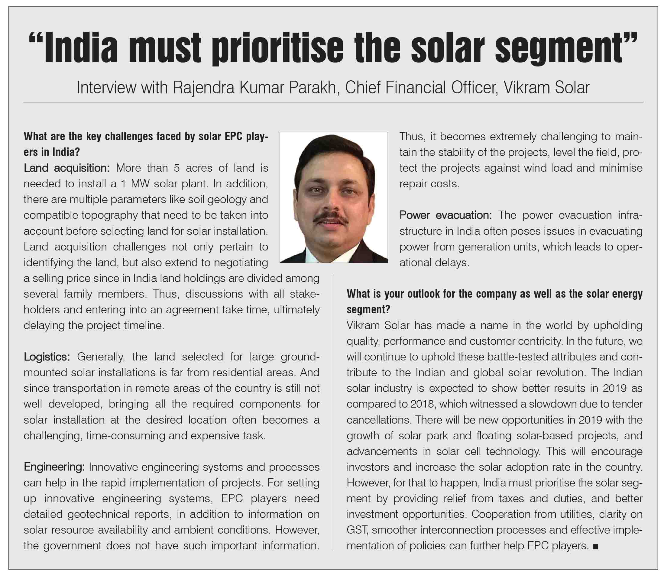 To meet the growing demand for solar energy, large Indian companies need to diversify their operations to provide a vast range of services. At present, very few Indian companies are vertically integrated, that is, companies that manufacture solar modules, undertake engineering, procurement and construction (EPC), and also provide operations and maintenance (O&M) services. Vikram Solar is one such company, which provides a range of services across the value chain.