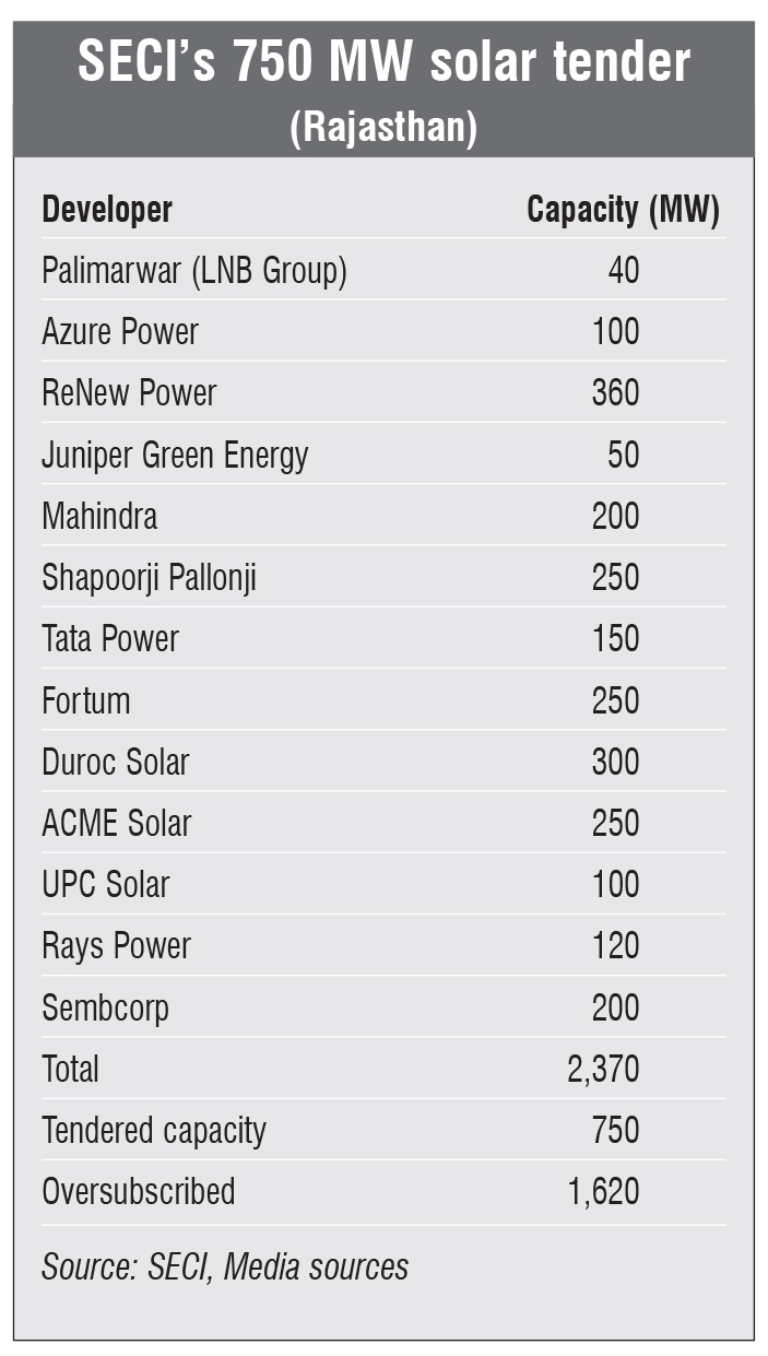 In the solar segment too, three solar photovoltaic (PV) tenders for Rajasthan, Gujarat and Maharashtra were oversubscribed. As many as 13 companies submitted bids totalling 2,370 MW for SECI’s 750 MW solar PV tender for Rajasthan. This was more than three times the auctioned capacity and the tender was oversubscribed by 1,620 MW. The bidding companies were Palimarwar Solar Project (LNB Group) (40