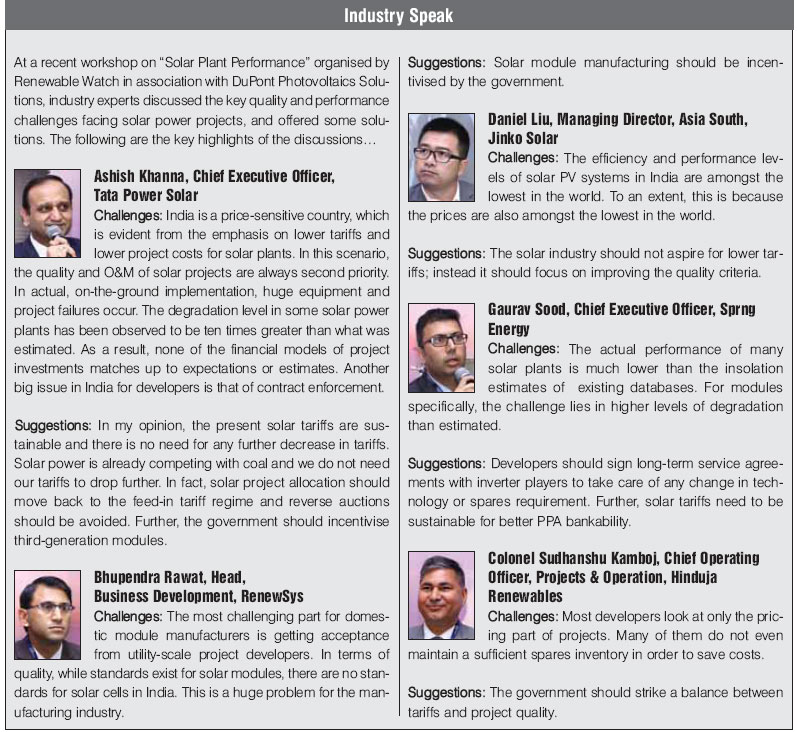 Renewable Watch recently conducted a workshop on “Solar Plant Performance”, wherein industry experts highlighted the key issues and pain points across the pre-construction, construction and operational stages of a solar plant. Some of them are as follows: