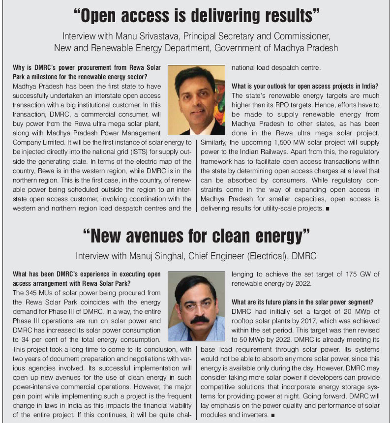 On April 18, 2019, the Delhi Metro Rail Corporation (DMRC) started procuring solar power from the Rewa Ultra Mega Solar Park in Madhya Pradesh. Through this landmark deal, DMRC has become the first commercial consumer of its scale and size to procure solar power through the open access route from another state. In this article, Renewable Watch presents DMRC’s green initiatives, the specifics of the open access deal, the implementation challenges and stakeholder perspectives…