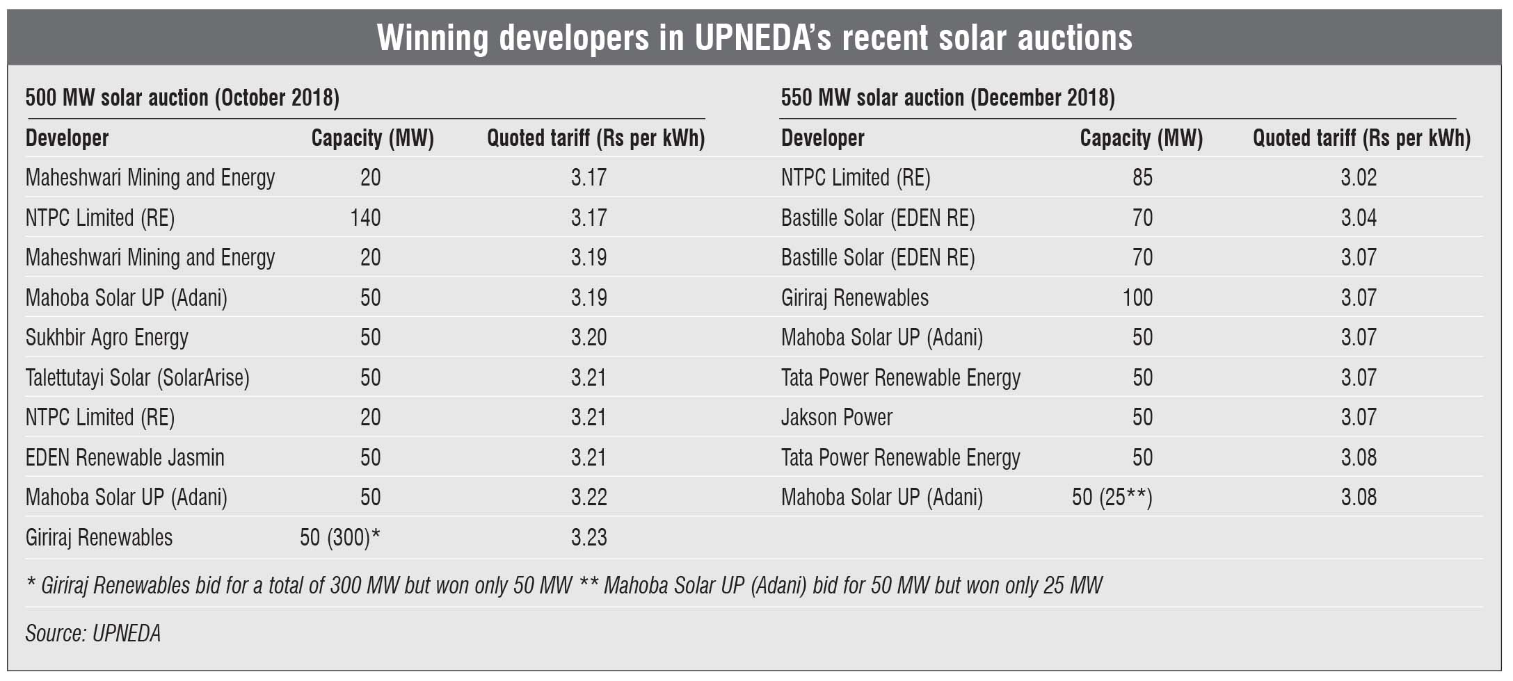 The Uttar Pradesh New and Renewable Energy Development Agency (UPNEDA) has issued three new solar power tenders between July 2018 and January 2019 after the cancellation of a 1 GW tender in June 2018 owing to higher tariffs quoted by developers. The auction for the first tender was conducted in October 2018 for 500 MW of solar power projects to be developed on a build-own-operate basis. The lowest tariff of Rs 3.17 per kWh was quoted by Maheshwari Mining and Energy, and NTPC Limited (RE) to develop 20 MW and 140 MW of capacities respectively.