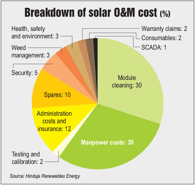 Even with specialised O&M services, a number of challenges have emerged that are impacting the performance of solar power plants in the long run. One of the major issues faced by operators is water shortage at project sites. With many solar power plants located in drought-prone and desert-like areas, non-availability of water for cleaning modules is going to pose a huge challenge in the future. The Central Ground Water Authority’s check on groundwater usage is further going to complicate matters. Another challenge faced by developers is related to inverter O&M. There have been instances of equipment manufacturers going out of business during the equipment lifetime, leaving installed inverters with no service and spares support. The lack of skilled and trained manpower for operating and maintaining these plants is another major constraint. Many operators, who spend a lot of time and resources on training local technicians in good O&M practices, find retaining the manpower a tough task. Also, quality control at substations and module cleaning technologies are still evolving.