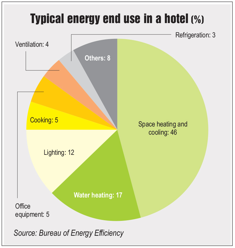 With domestic travel growing, both for business and leisure, and India becoming an attractive international tourist destination, there is a spurt in the number of hotels being set up. Moreover, the hospitality business is no more a seasonal business; hotels receive normal to heavy traffic throughout the year. Thus, they have to keep their power-consuming apparatus switched on even if there is lower occupancy. As a result, power consumption by the hospitality industry is on the rise. Air conditioners account for the majority of the power requirements as Indian hotels need round-the-year air conditioning due to a subtropical climate. Water heating and lighting needs followed by cooking, office equipment and refrigeration are the other major power-consuming applications in a hotel. In fact, power costs account for 8-10 per cent of the operating expenses of an average Indian hotel. These costs are only expected to increase in the future.