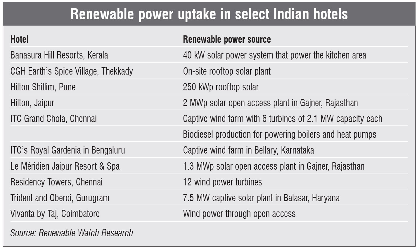 As of today, ITC Limited’s hotels in total meet more than 58 per cent of their electricity requirements through renewable energy sources such as wind and solar. In 2017-18, Indian Hotels Company Limited, with its flagship brand, Taj, met 21.75 per cent of the total energy consumption of 60 hotels through renewable energy sources. Both ITC Limited and Indian Hotels Company Limited are expanding their solar and wind energy footprint. Other large hotel chains like Marriott International and Hyatt Hotels Corporation are also exploring renewable energy solutions as part of their corporate strategy. In fact, Mahindra Holidays & Resorts India Limited has committed to join RE 100, a global renewable energy campaign led by The Climate Group. It has also set a target to power 100 per cent of its global operations with renewable electricity by 2050.