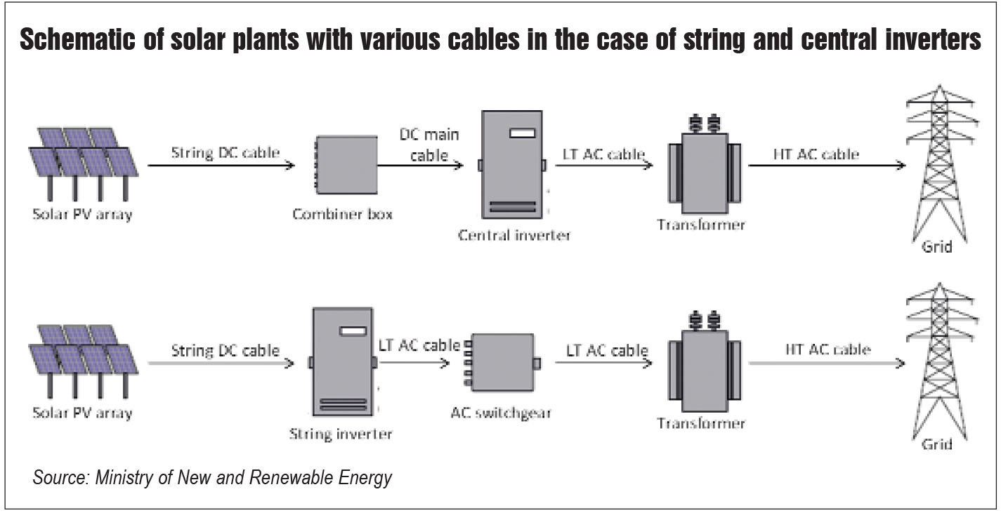 Since solar panels are connected in series, inverters should be installed close to the feed-in counter to minimise losses, which are higher on the AC side than on the DC side. Thus, the DC generated from solar panels should reach the solar inverter with minimum power loss. Power loss is determined by voltage drop which, in turn, depends on cable resistance as the current remains constant. Resistance is a factor of cable length, cross-section area and material resistivity. An optimum-sized cable should ideally have a short cable length and a larger cross-section area. Since cable length depends on the distance among various components and resistivity is an inherent property of the constituent material, the design focus is on increasing the thickness or cross-section area of the cable as long as it is economically feasible. The DC main cables are designed to ensure that generation loss is lower than 1 per cent of the peak power output from the solar project.