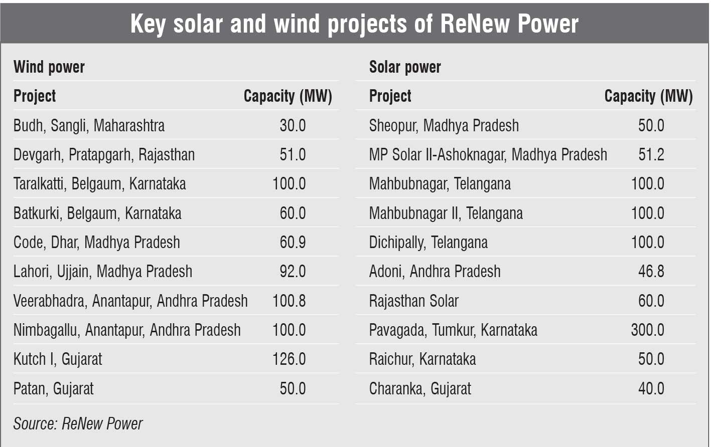 Along with bidding for large capacities, ReNew Power engages in frequent acquisitions as part of its business strategy in order to stay ahead in the game. The company made a series of acquisitions in late 2017 and early 2018. To begin with, it acquired the assets of the Vikram Solar Group with a portfolio of 30 MW. Then, it acquired 100 per cent stake in KCT Renewable Energy Private Limited for over Rs 10 billion, taking ownership of the latter’s three fully operational wind power projects in Andhra Pradesh with a combined capacity of 103 MW. It also acquired Ostro Energy Private Limited’s large portfolio of 1,100 MW for a value of about Rs 102 billion. Following this, ReNew Power acquired 100 per cent stake in Indian Energy Limited at a price of Rs 364 million for a total wind power capacity of 41.3 MW. In April 2019, it acquired two of Suzlon’s solar assets totalling 30 MW for Rs 297.3 million and is reportedly exploring more such deals in the future.